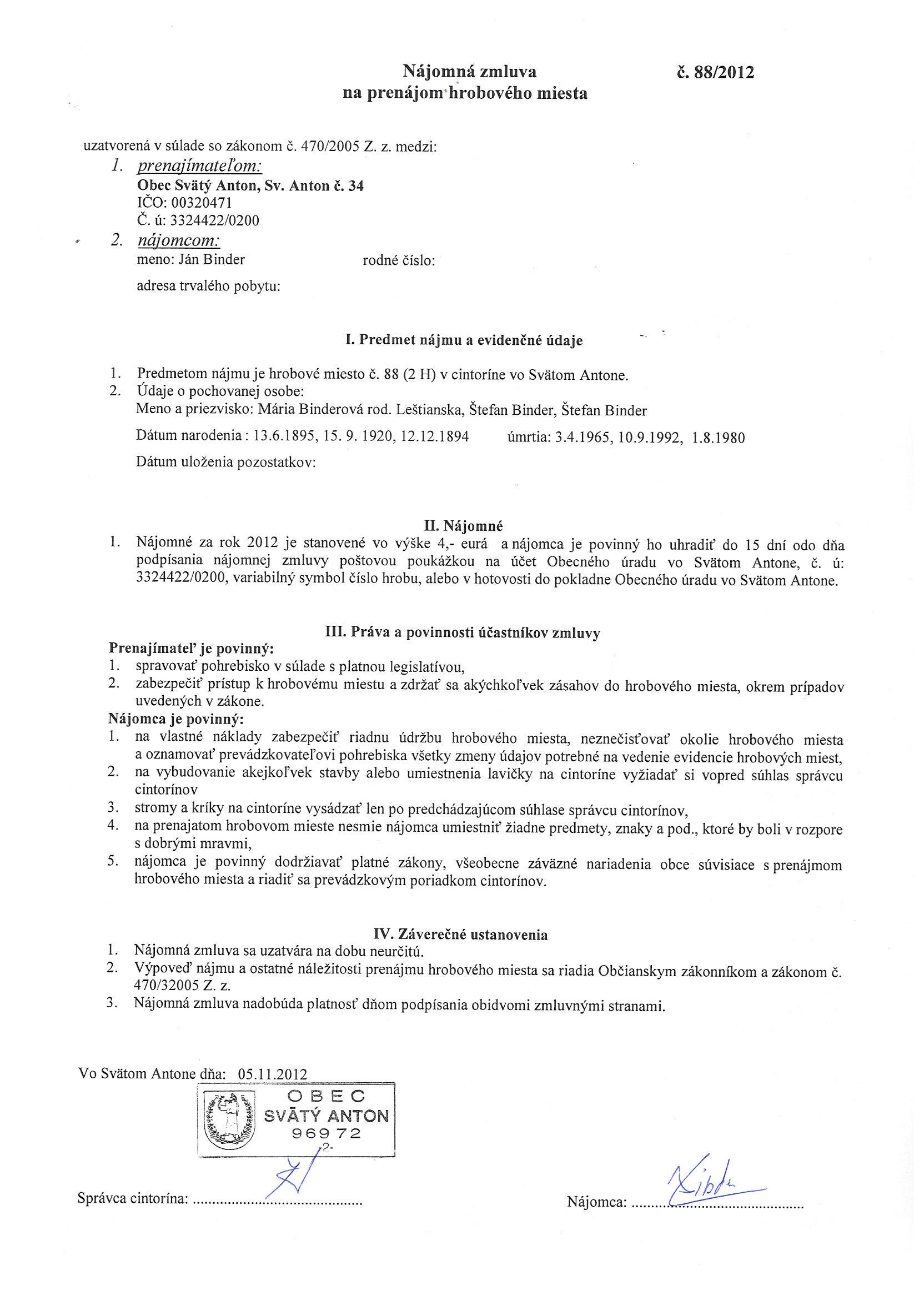 88/2012, Ján Binder, Prenájom hrobového miesta |
