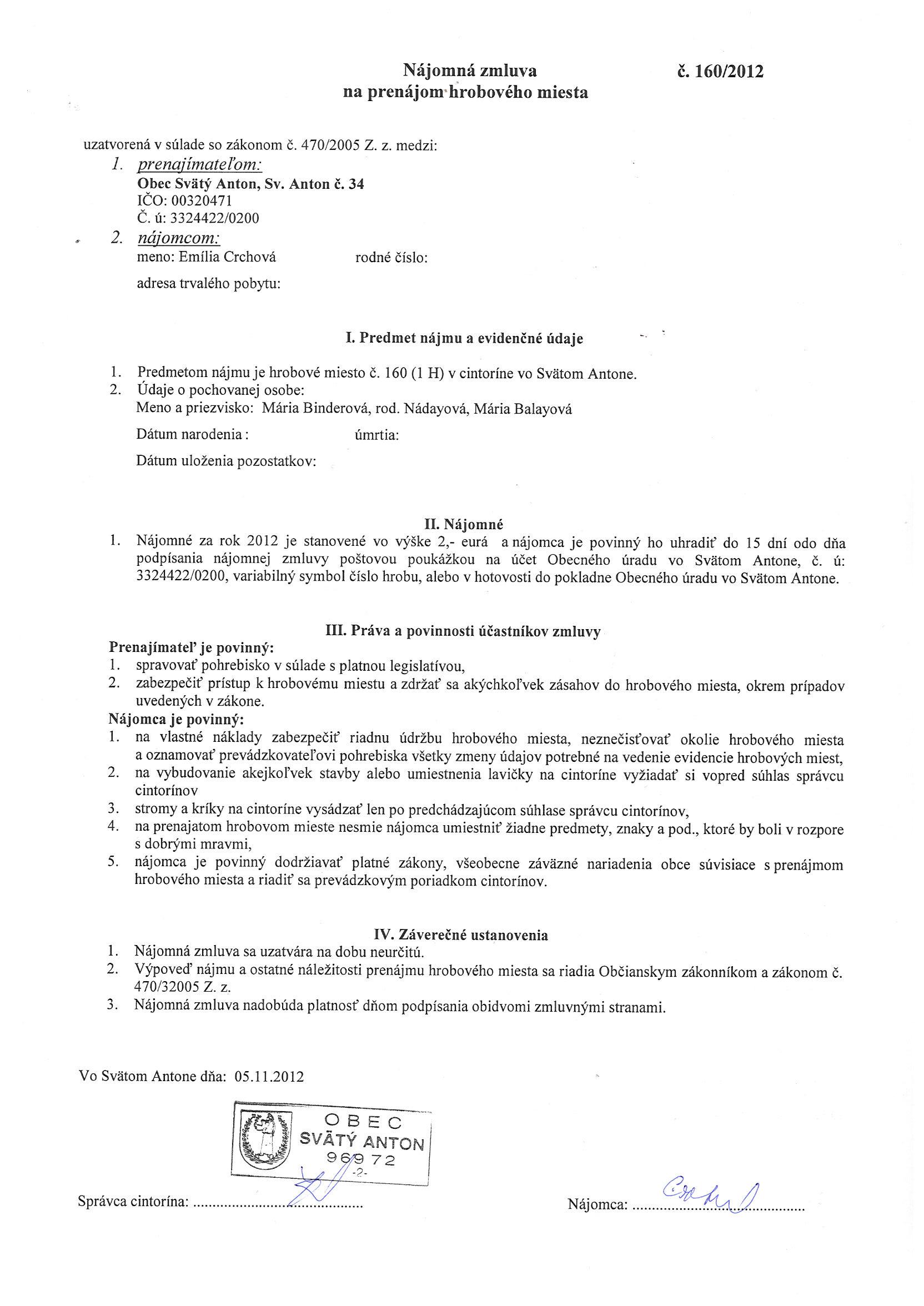 160/2012, Emília Crchová, Prenájom hrobového miesta |