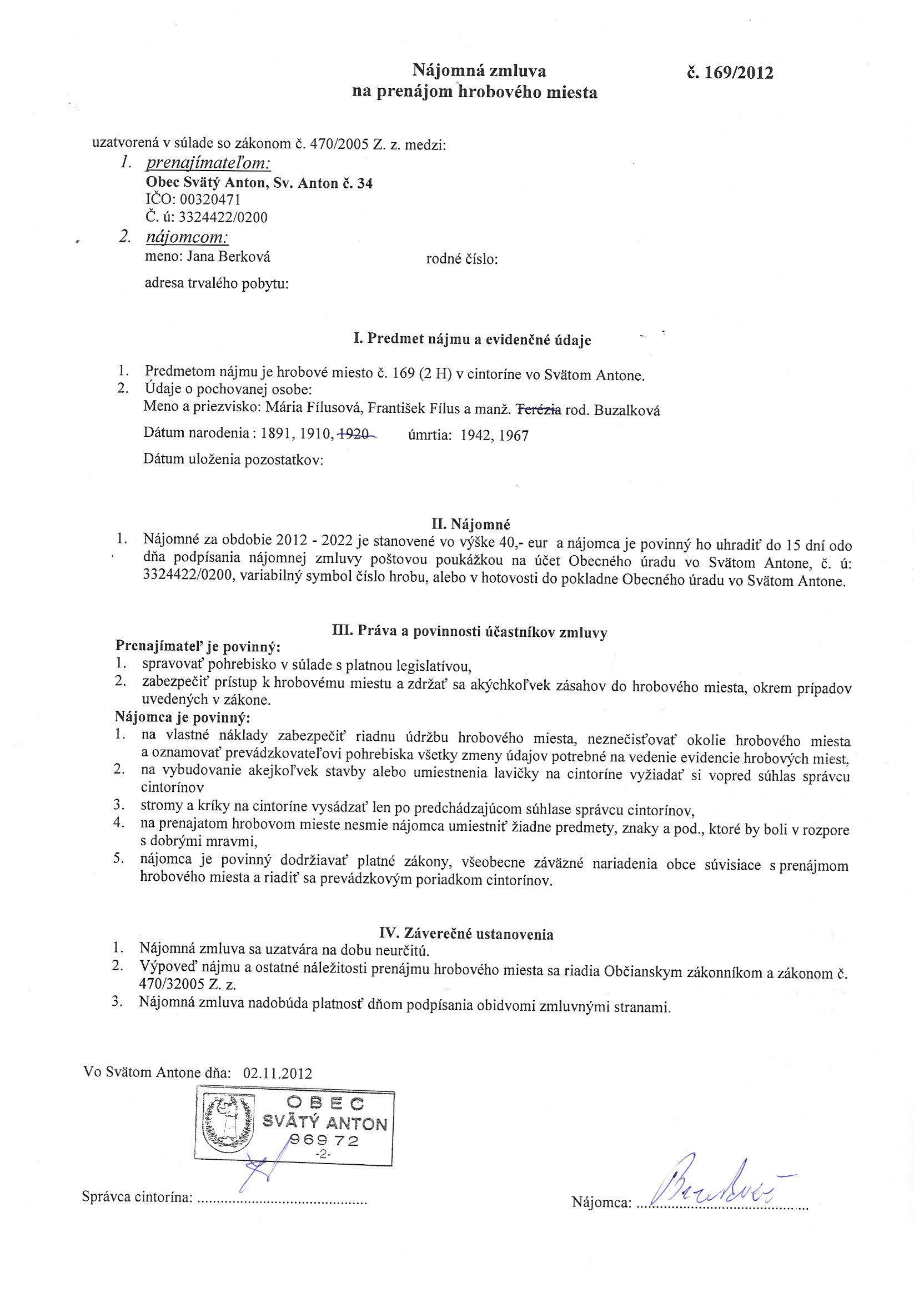 169/2012, Jana Berková, Prenájom hrobového miesta |