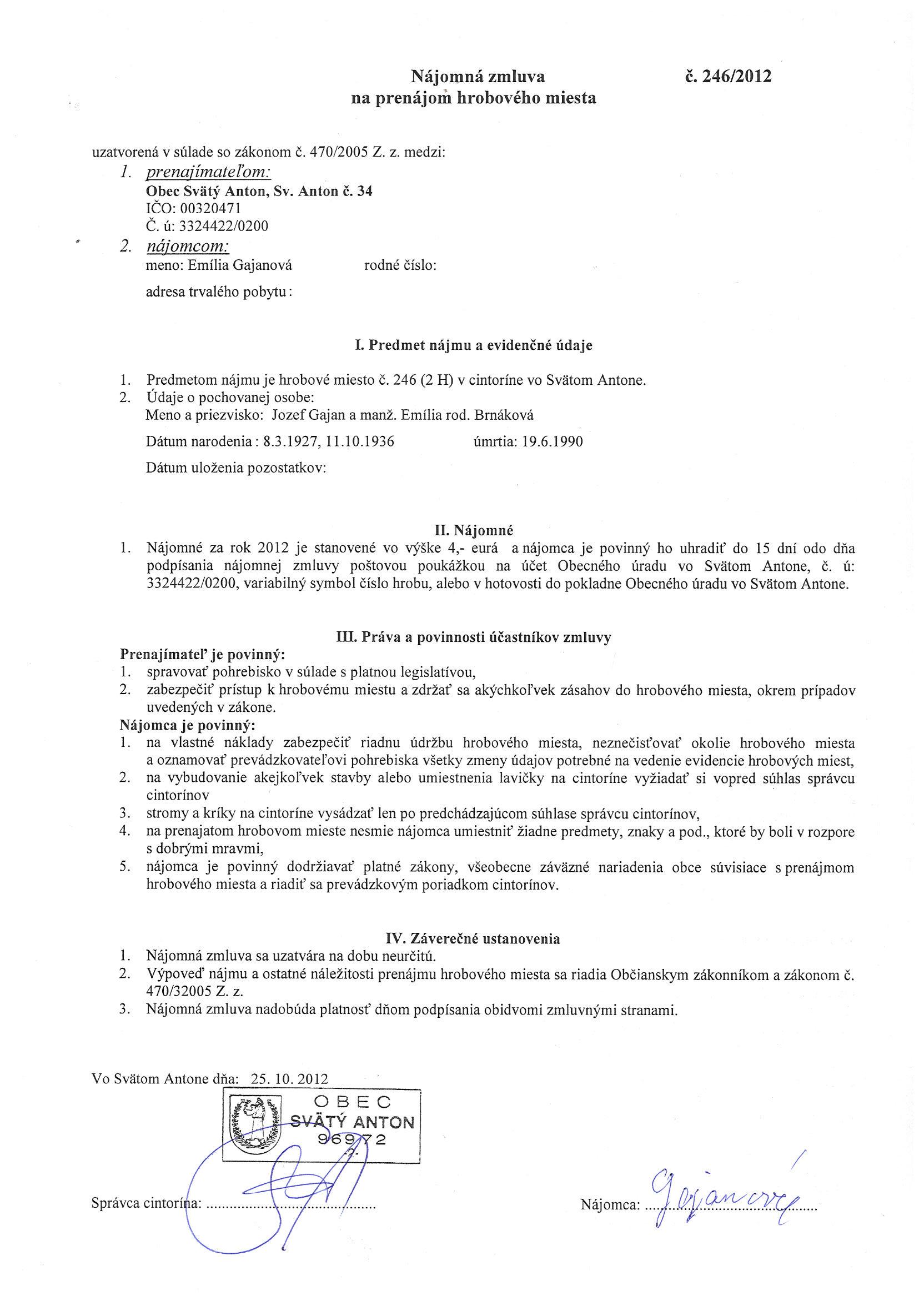246/2012, Emília Gajanová, Prenájom hrobového miesta |