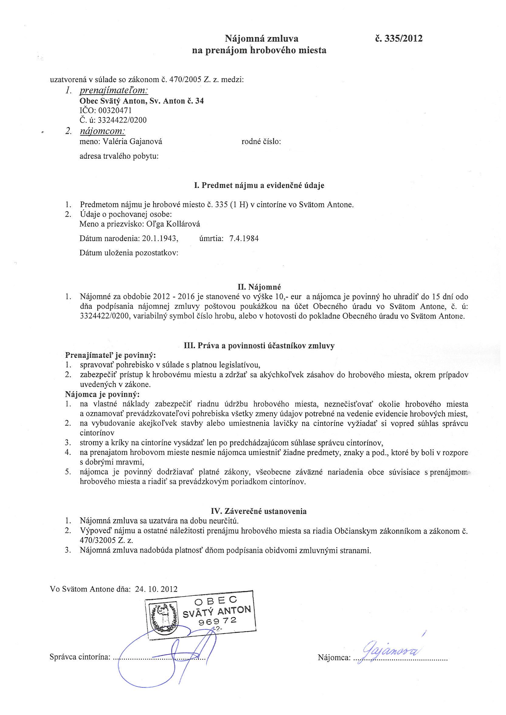 335/2012, Valéria Gajanová, Prenájom hrobového miesta |