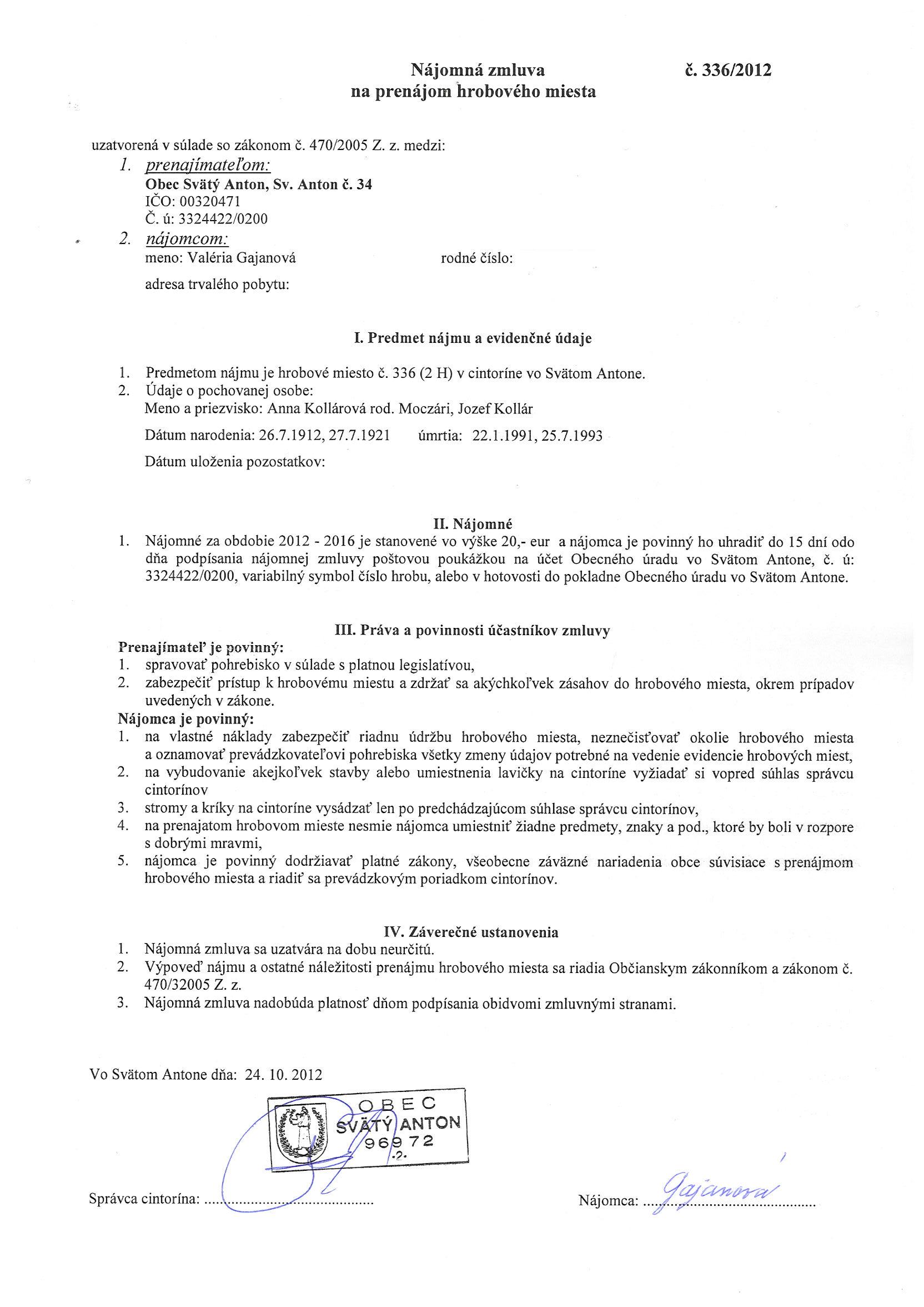 336/2012, Valéria Gajanová, Prenájom hrobového miesta |