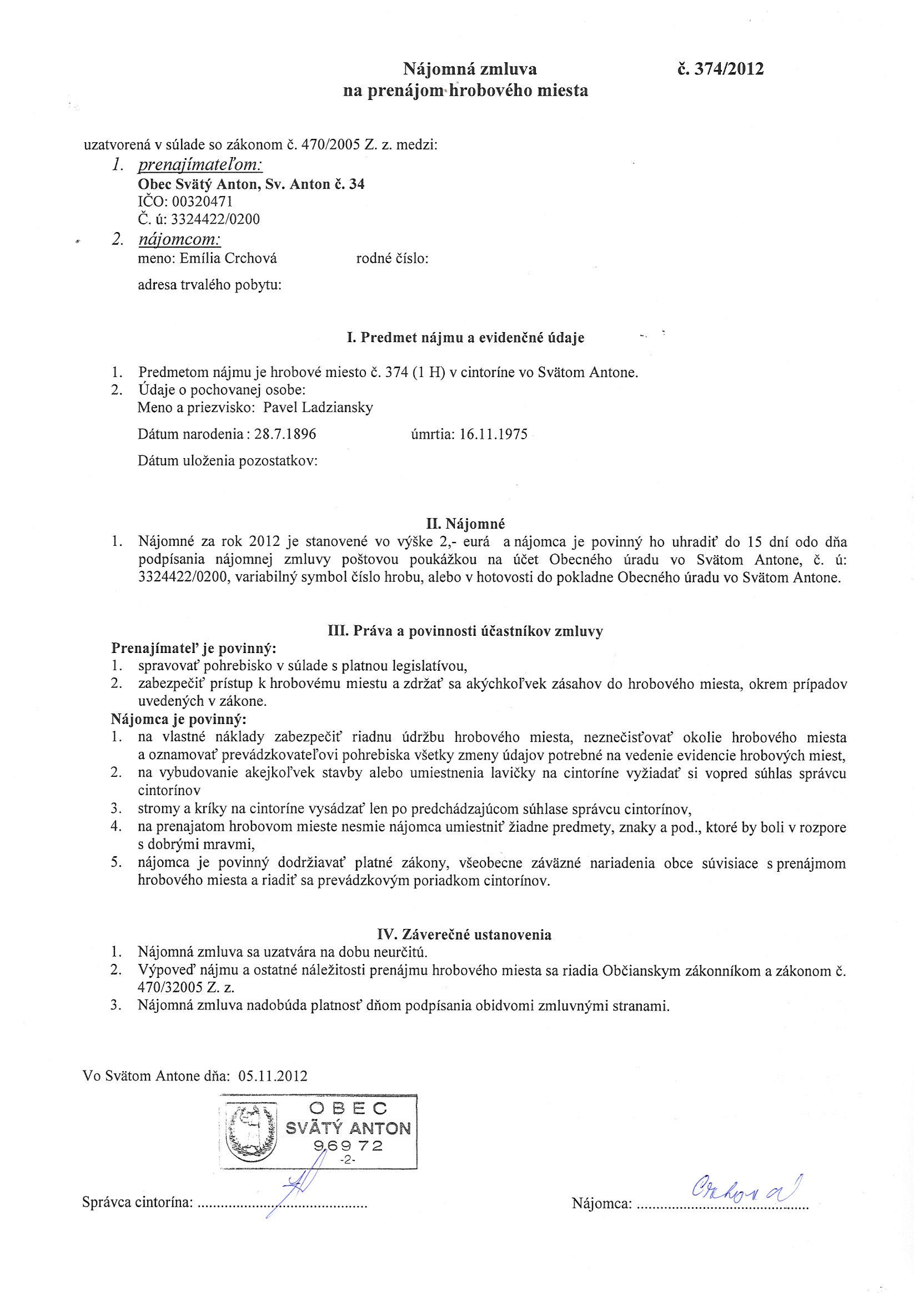 374/2012, Emília Crchová, Prenájom hrobového miesta |