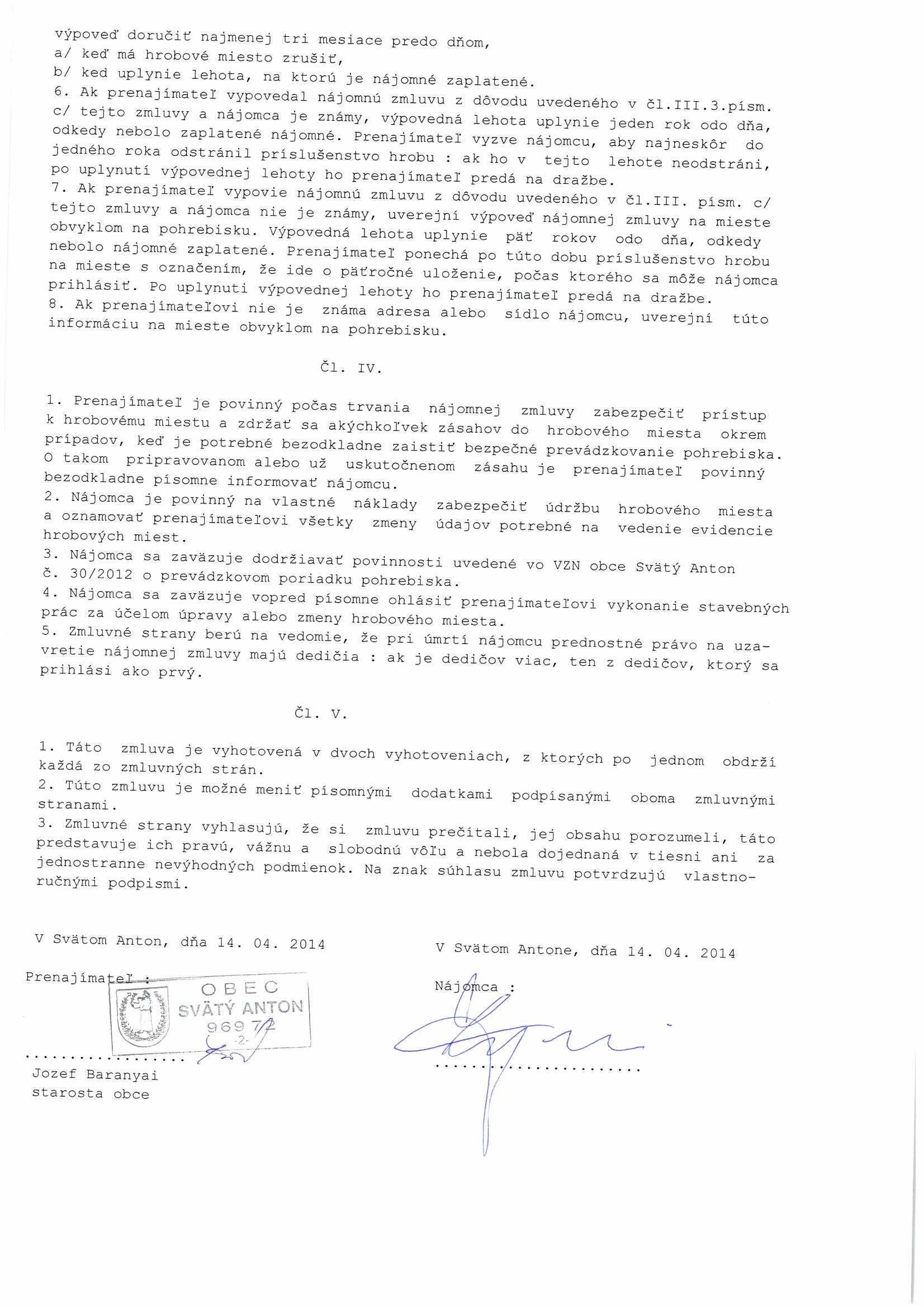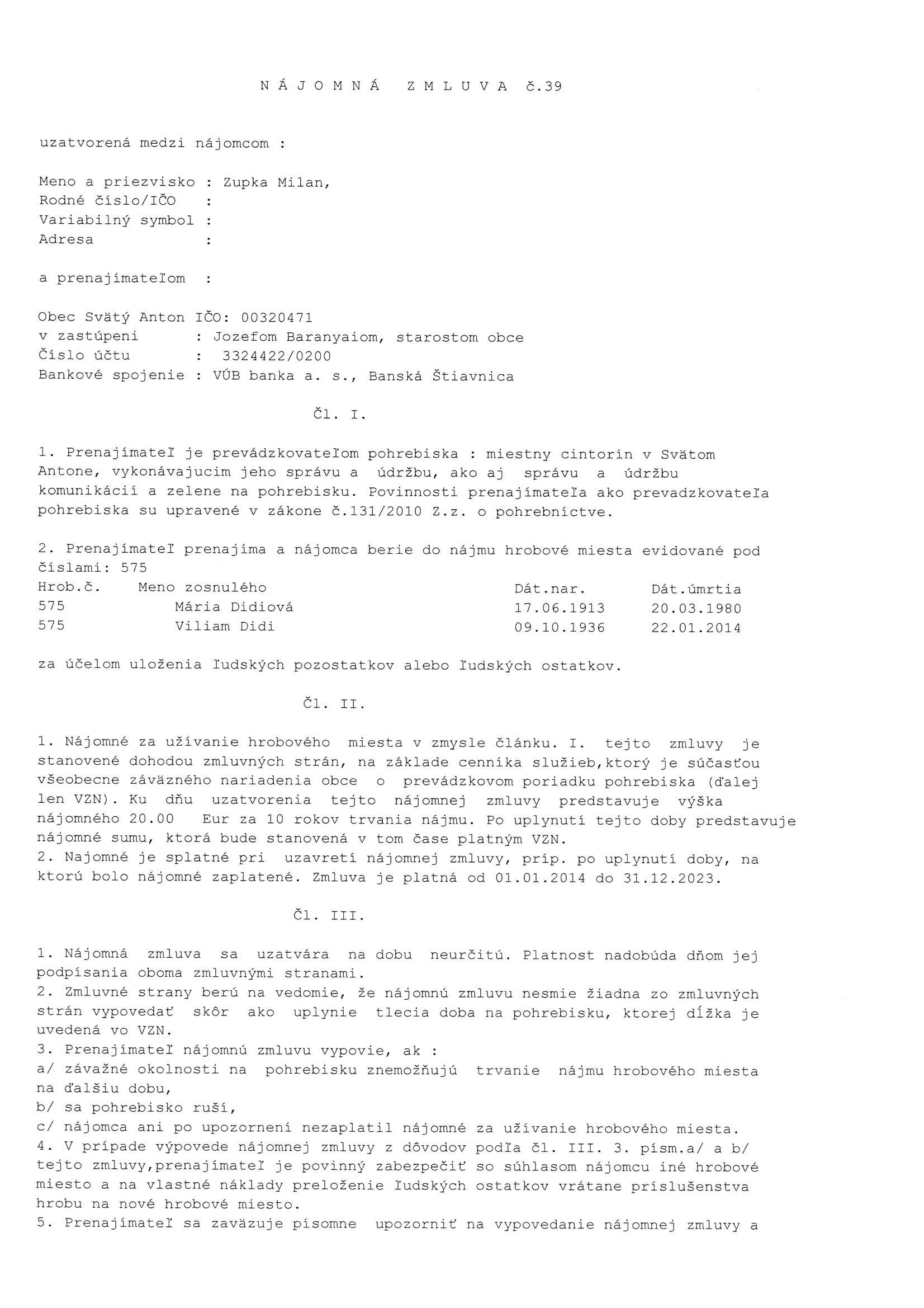 39/2014, Milan Zupka, Banská Štiavnica, Prenájom hrobového miesta |