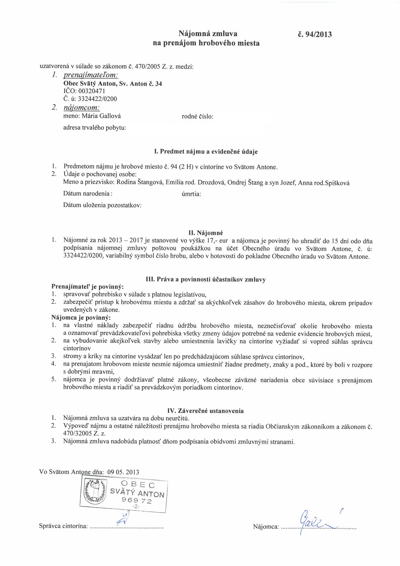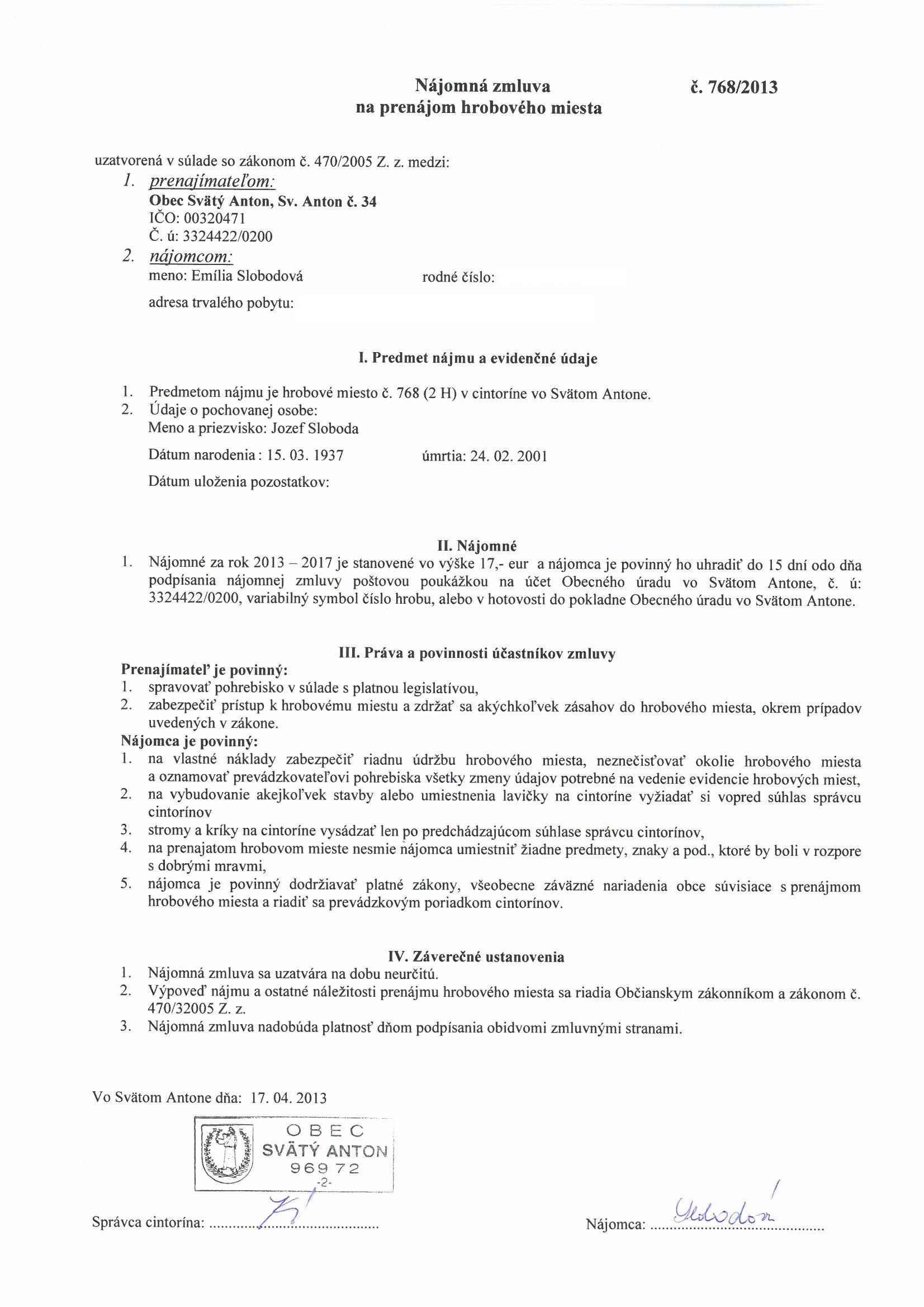 768/2013, Emília Slobodová, Prenájom hrobového miesta |