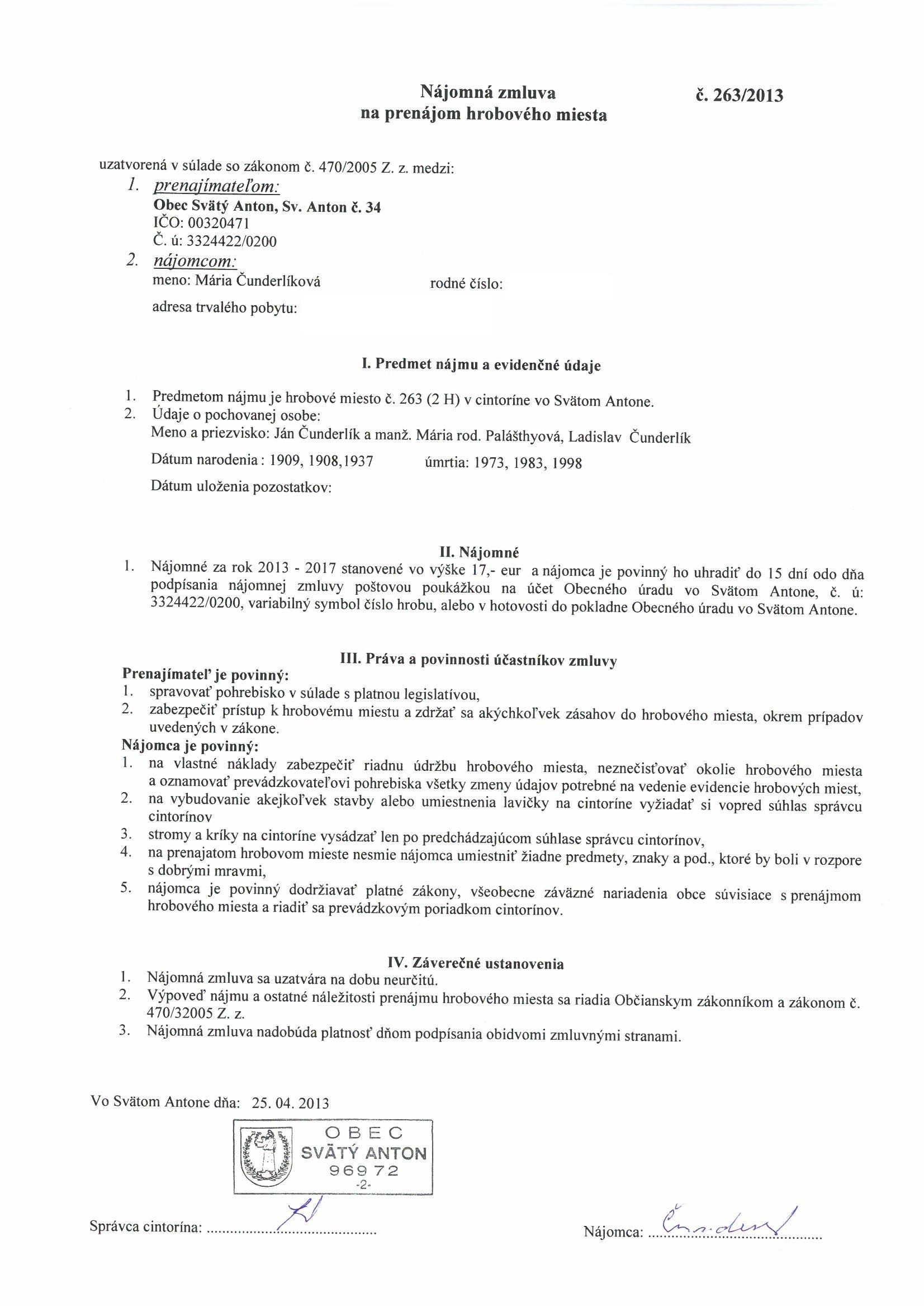 263/2013, Mária Čunderlíková, Prenájom hrobového miesta |