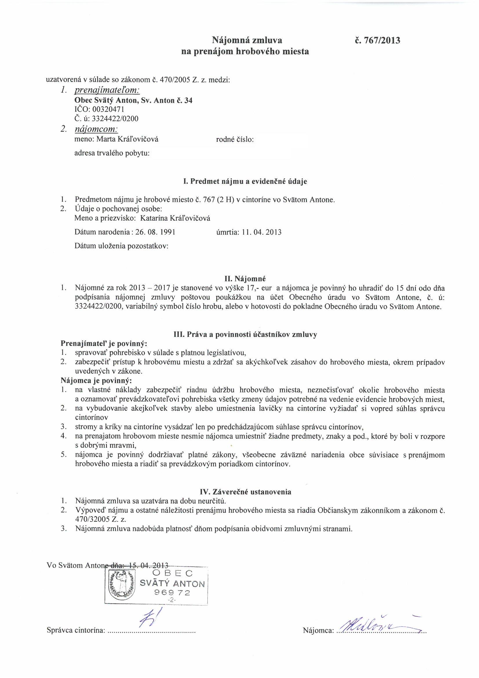 767/2013, Marta Kráľovičová, Prenájom hrobového miesta |