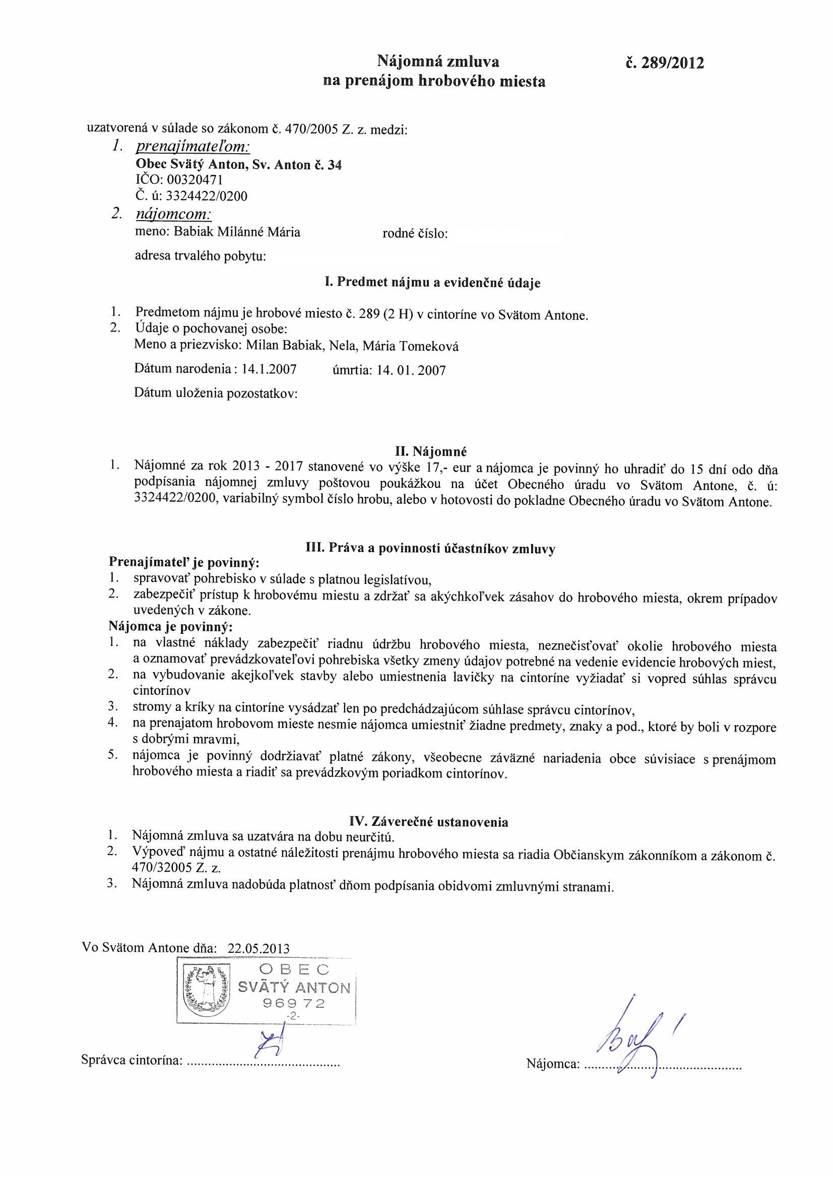 289/2013, Babiak Milánné Mária, Prenájom hrobového miesta |
