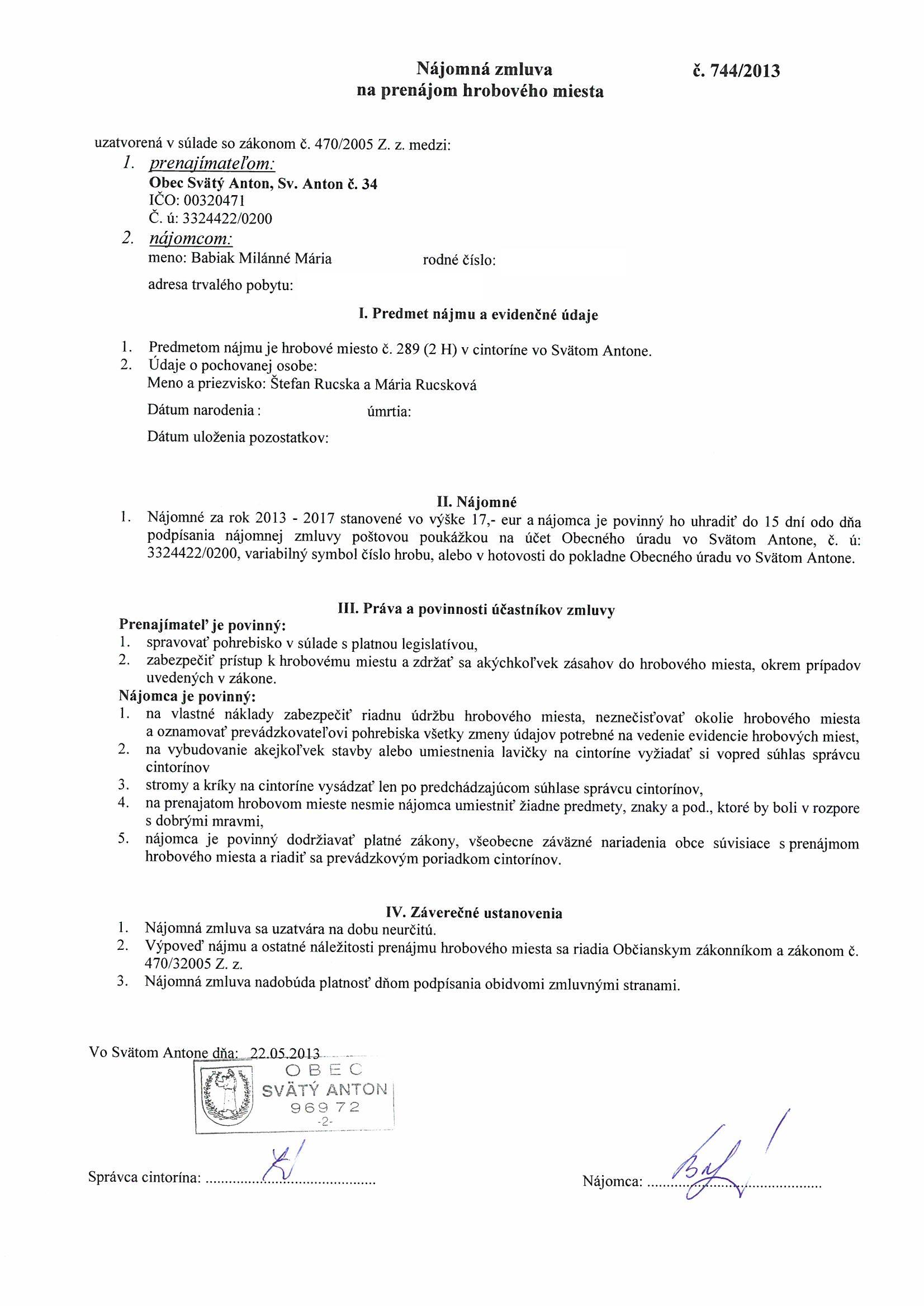 744/2013, Babiak Milánné Mária, Prenájom hrobového miesta |
