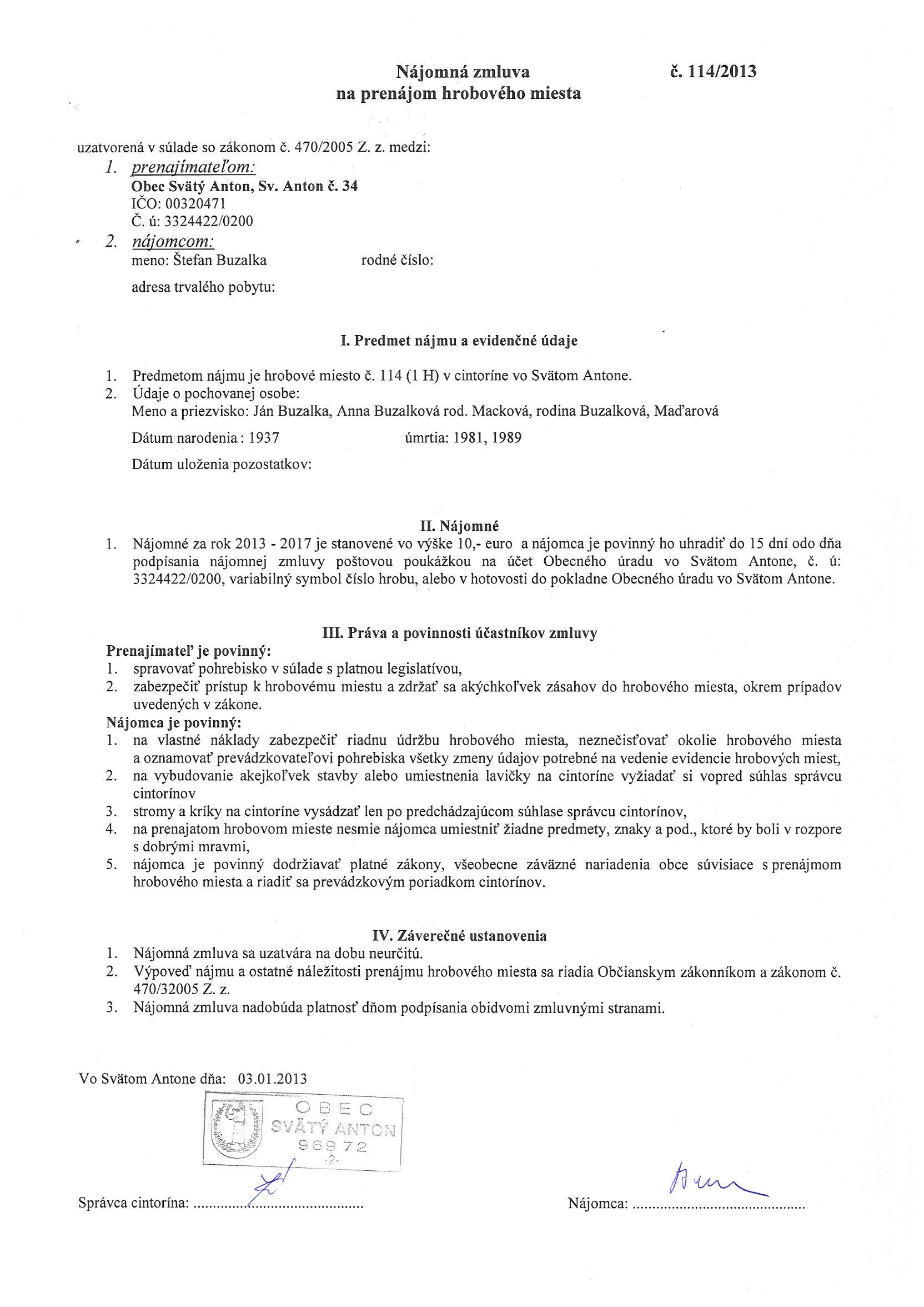 114/2013, Štefan Buzalka, Prenájom hrobového miesta. |
