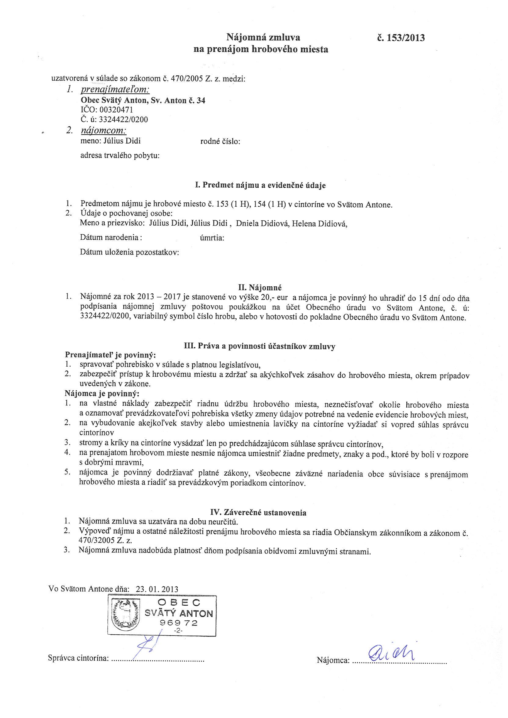 153/2013, Július Didi, Prenájom hrobového miesta. |