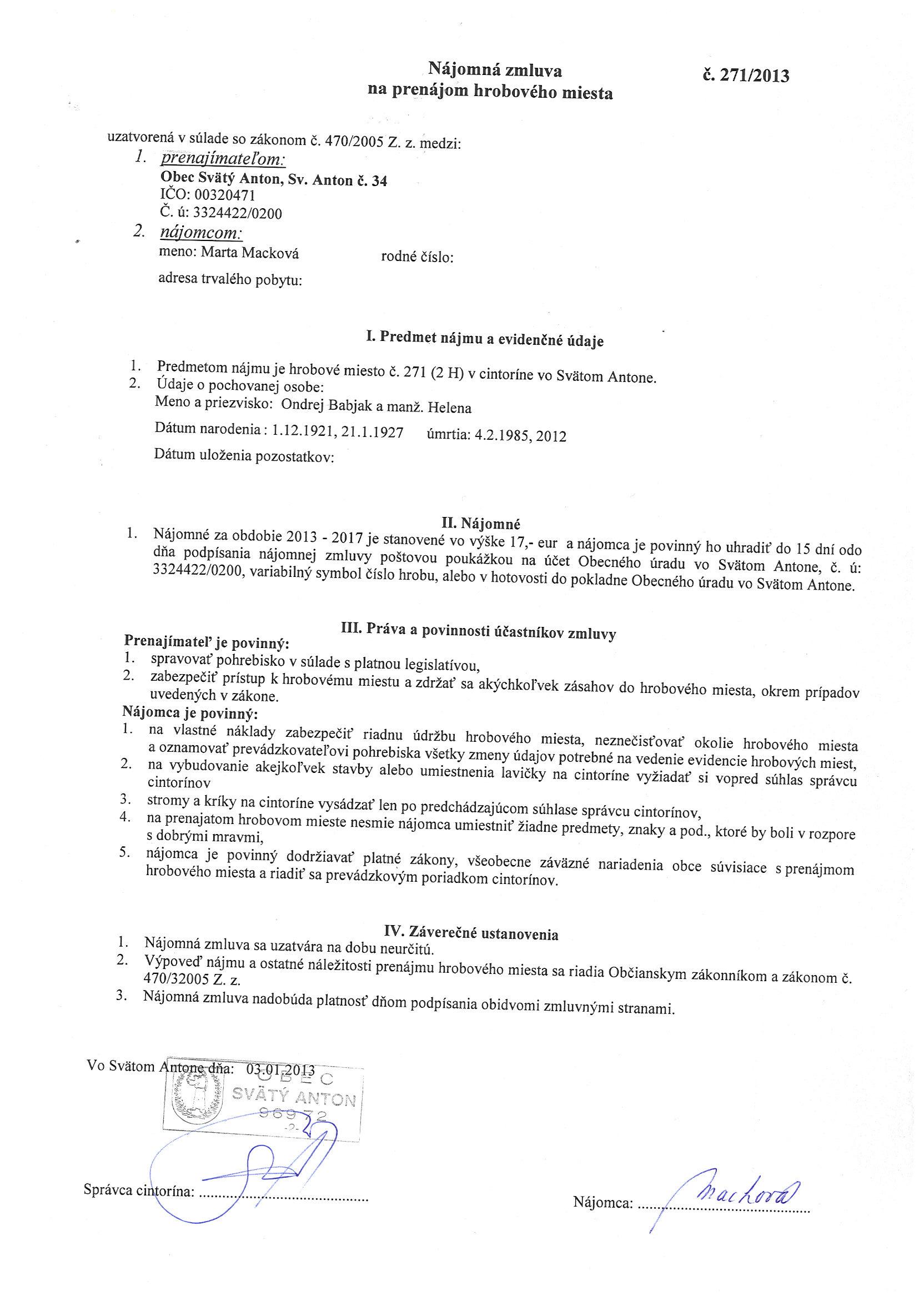 271/2013, Marta Macková, Prenájom hrobového miesta. |
