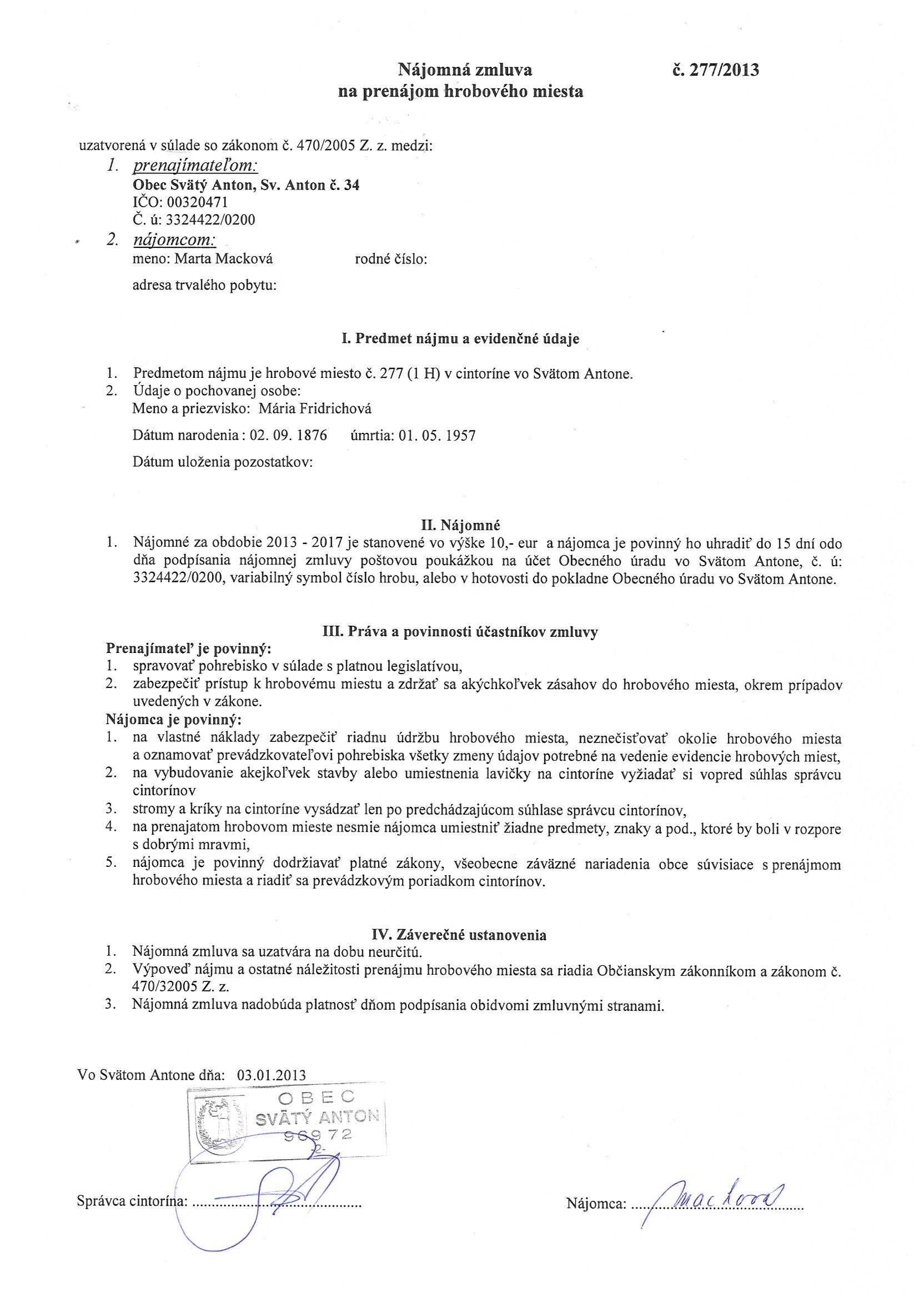 277/2013, Marta Macková, Prenájom hrobového miesta. |
