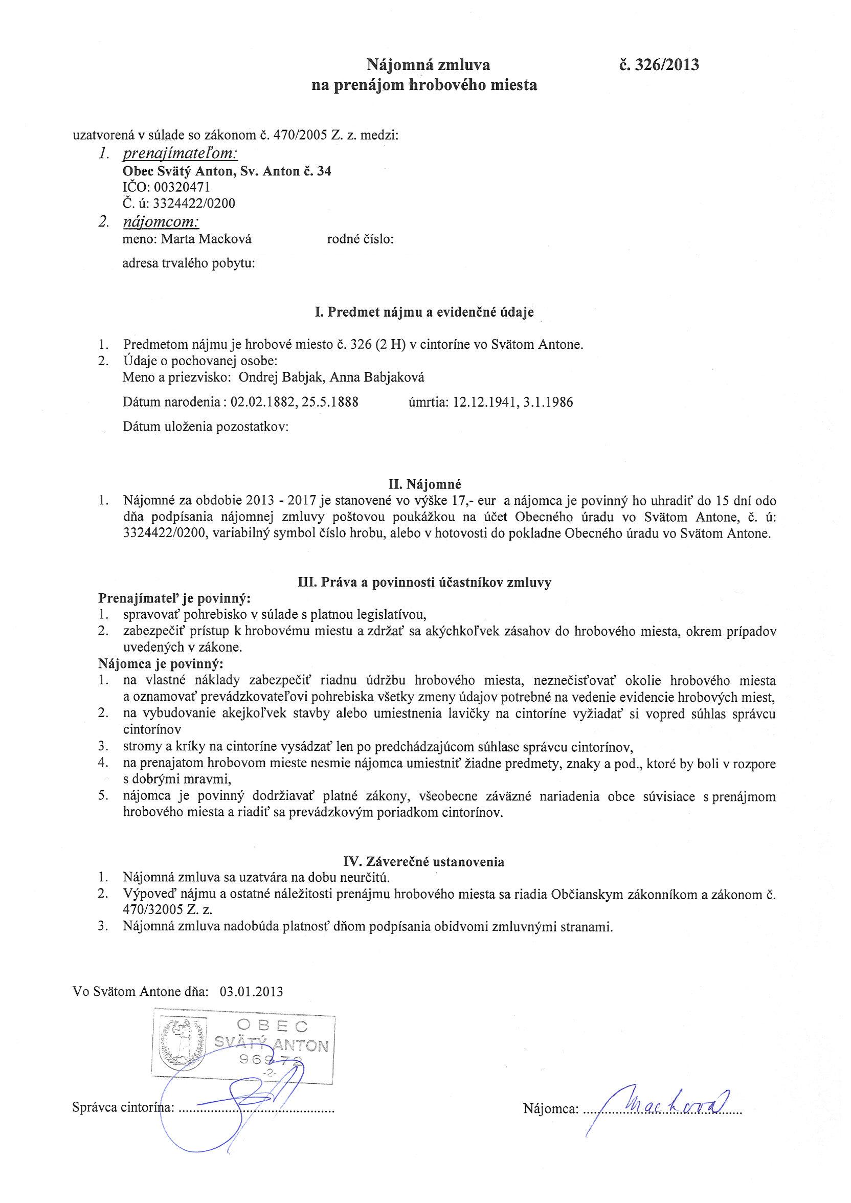 326/2013, Marta Macková, Prenájom hrobového miesta. |