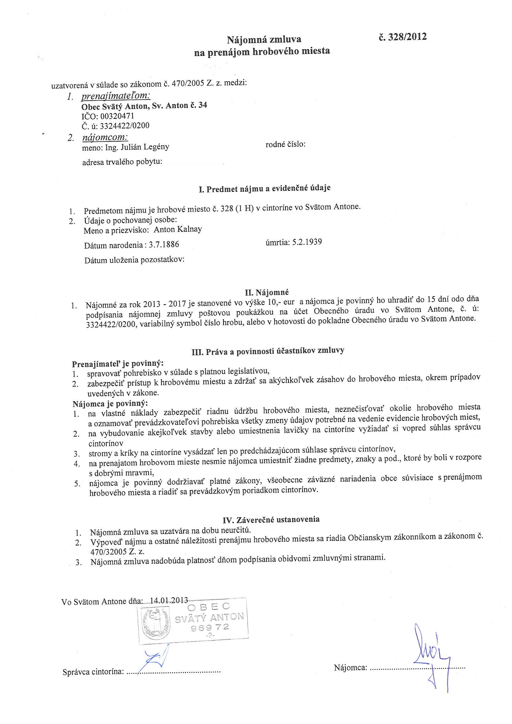 328/2013, Ing. Julián Legény, Prenájom hrobového miesta. |