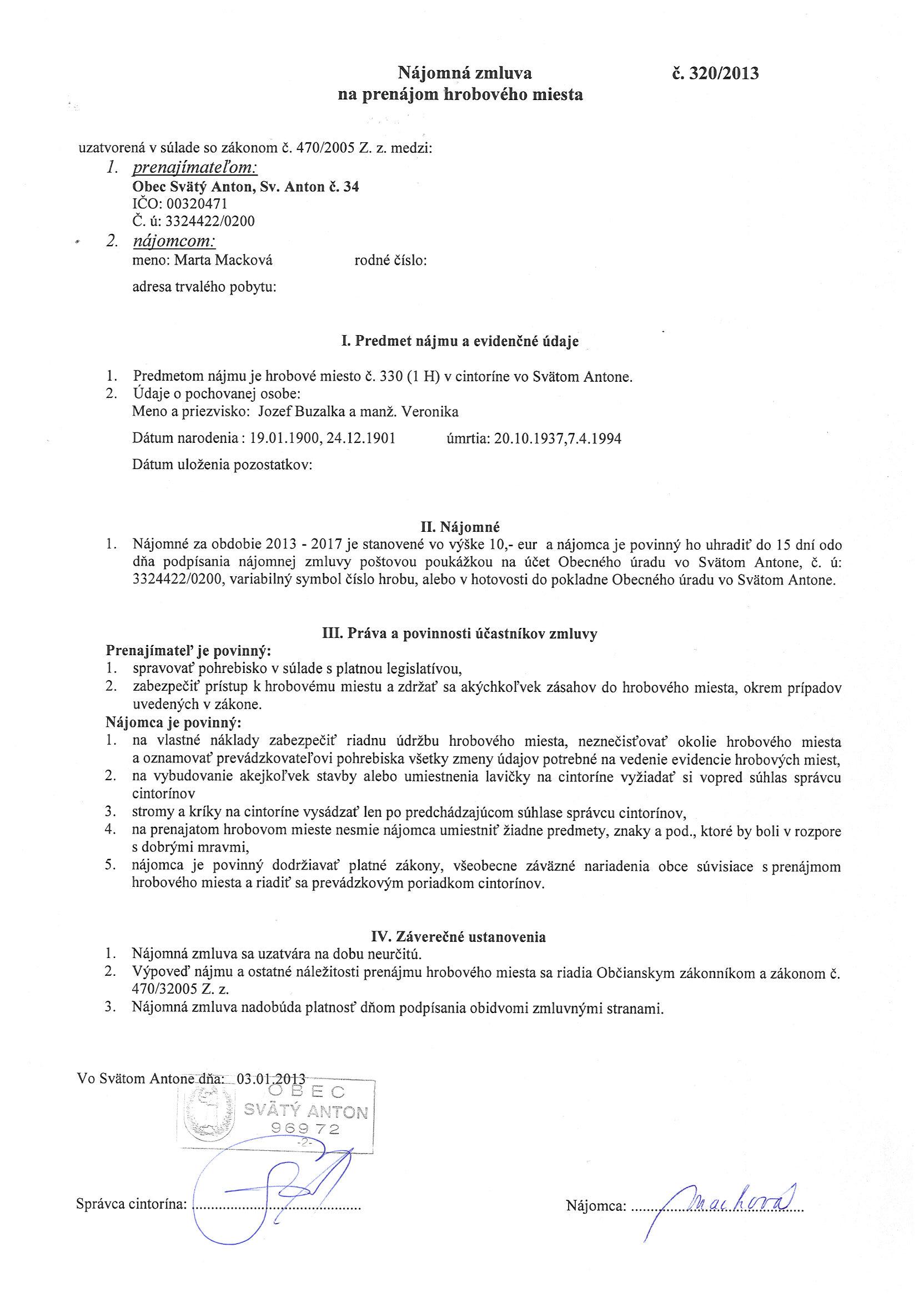 320/2013, Marta Macková, Prenájom hrobového miesta. |