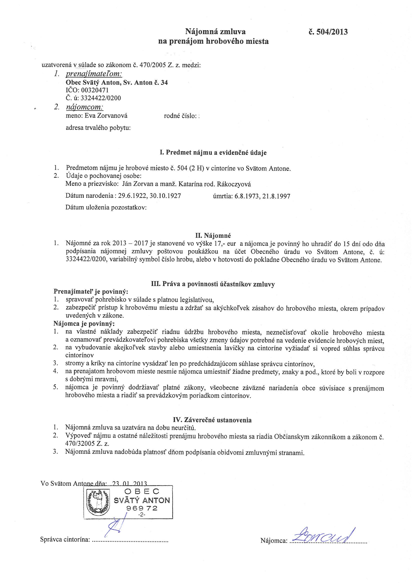 504/2013, Eva Zorvanová, Prenájom hrobového miesta. |