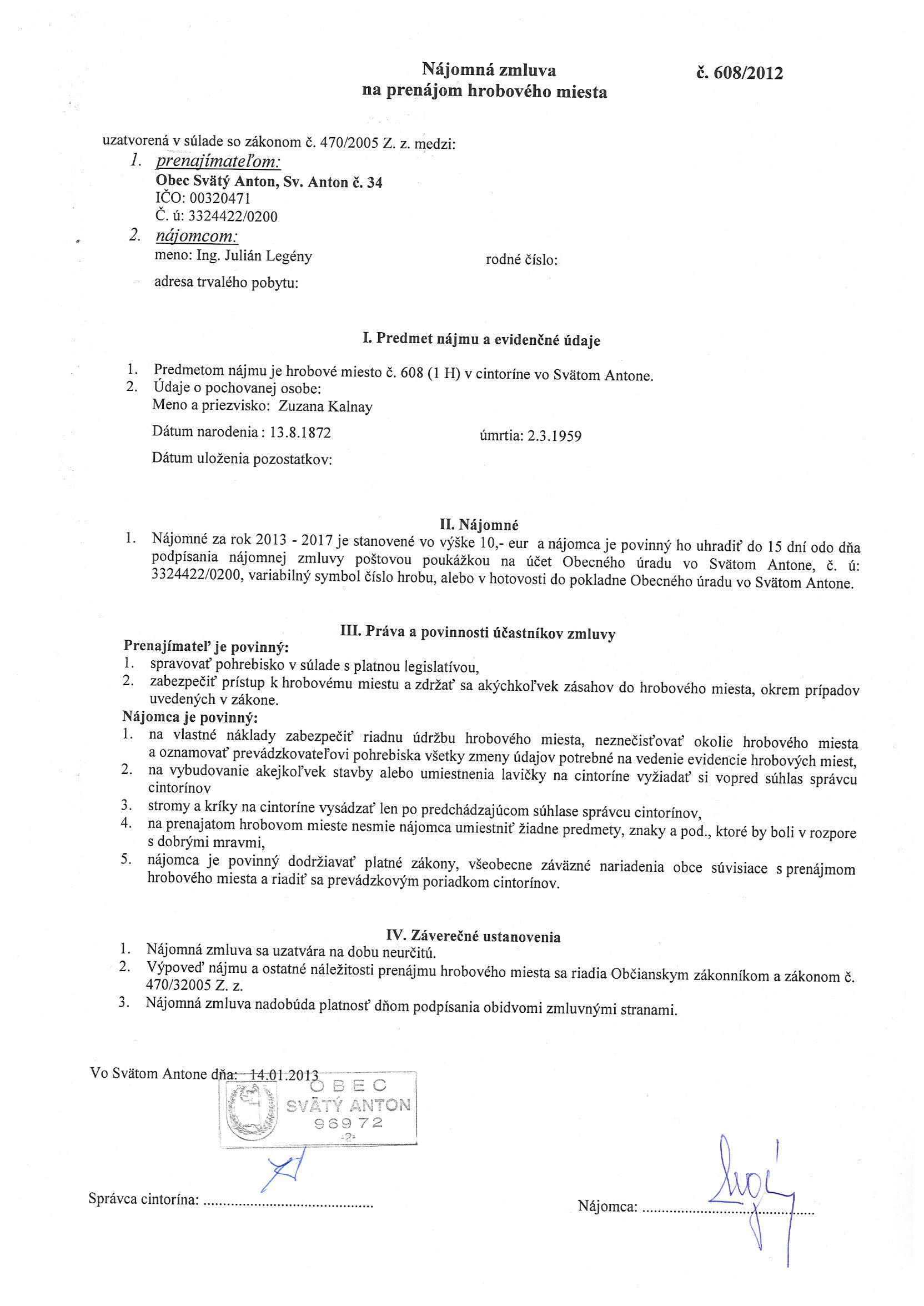 608/2013, Ing. Julián Legény, Prenájom hrobového miesta. |
