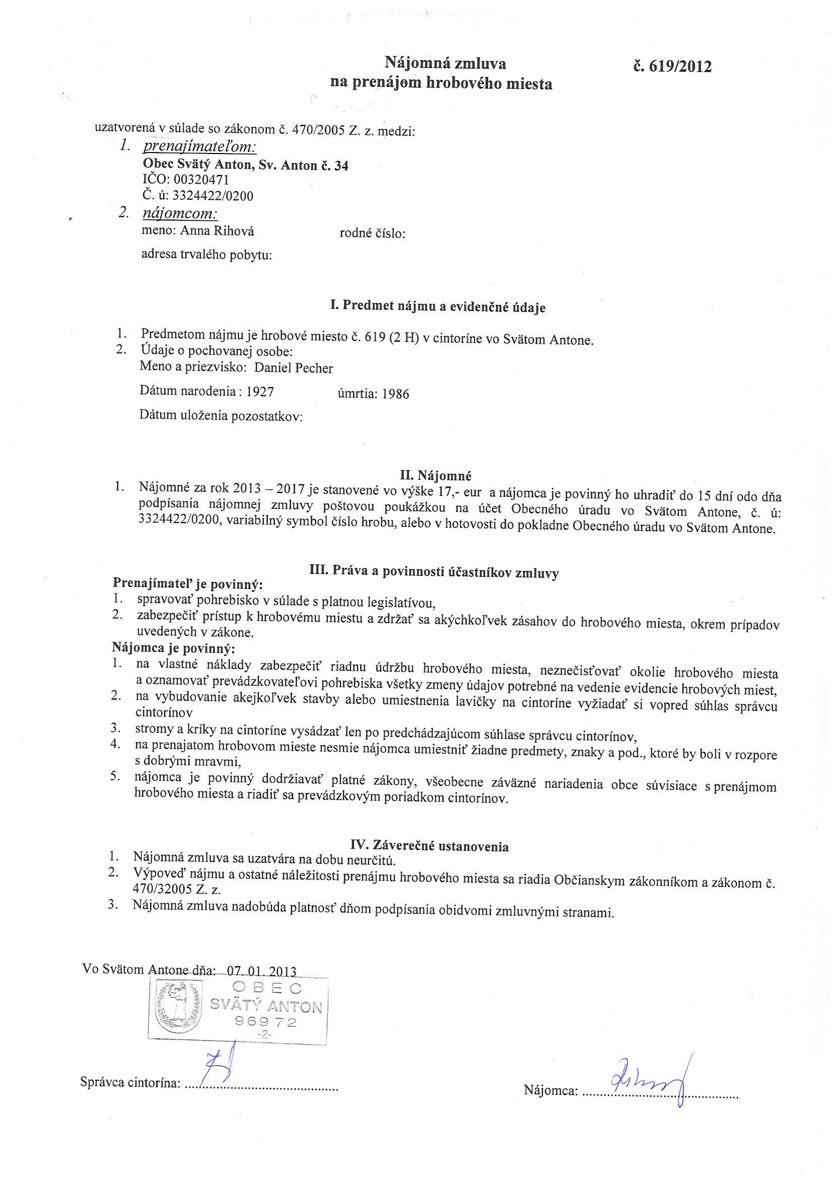 619/2013, Anna Rihová, Prenájom hrobového miesta. |