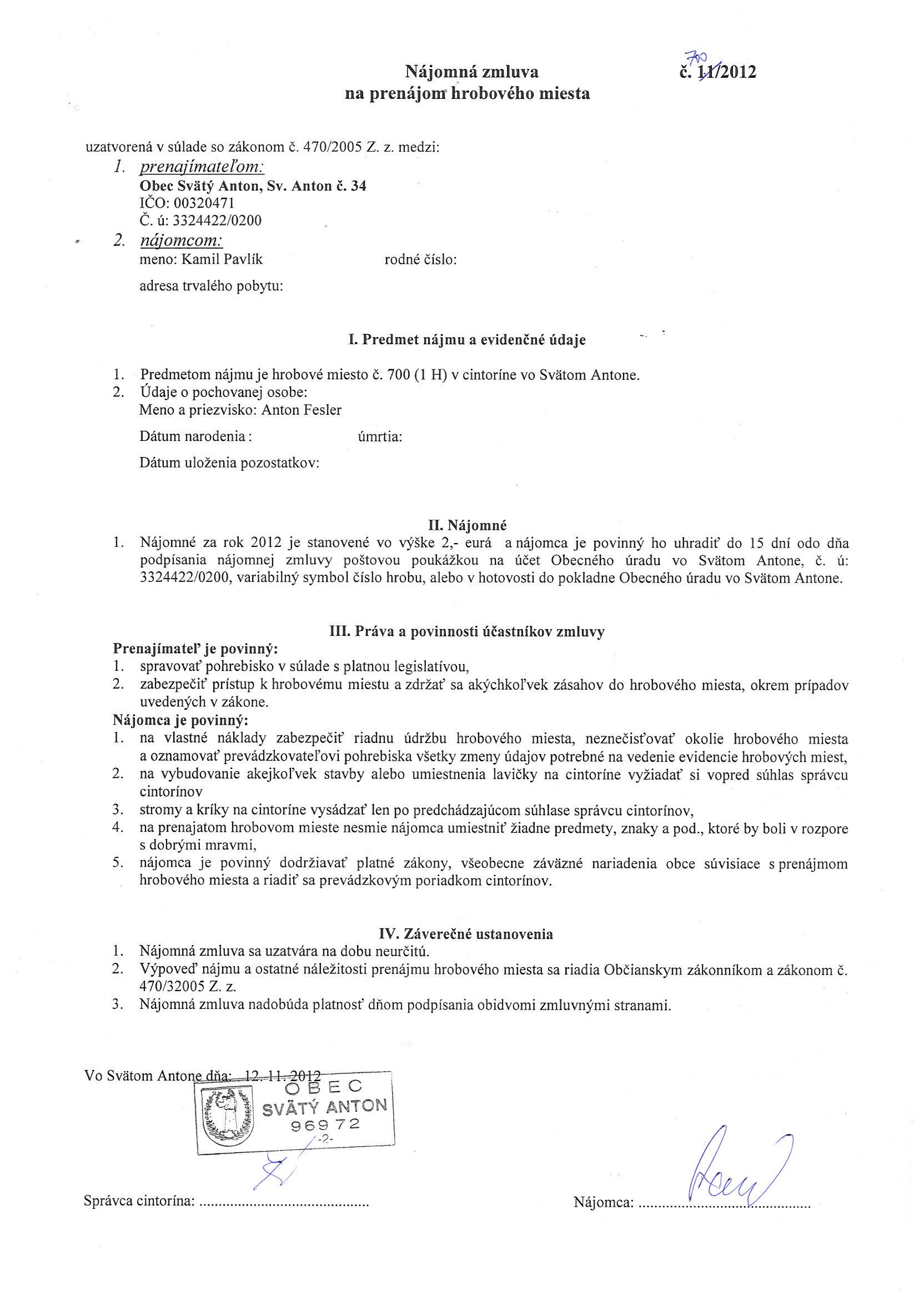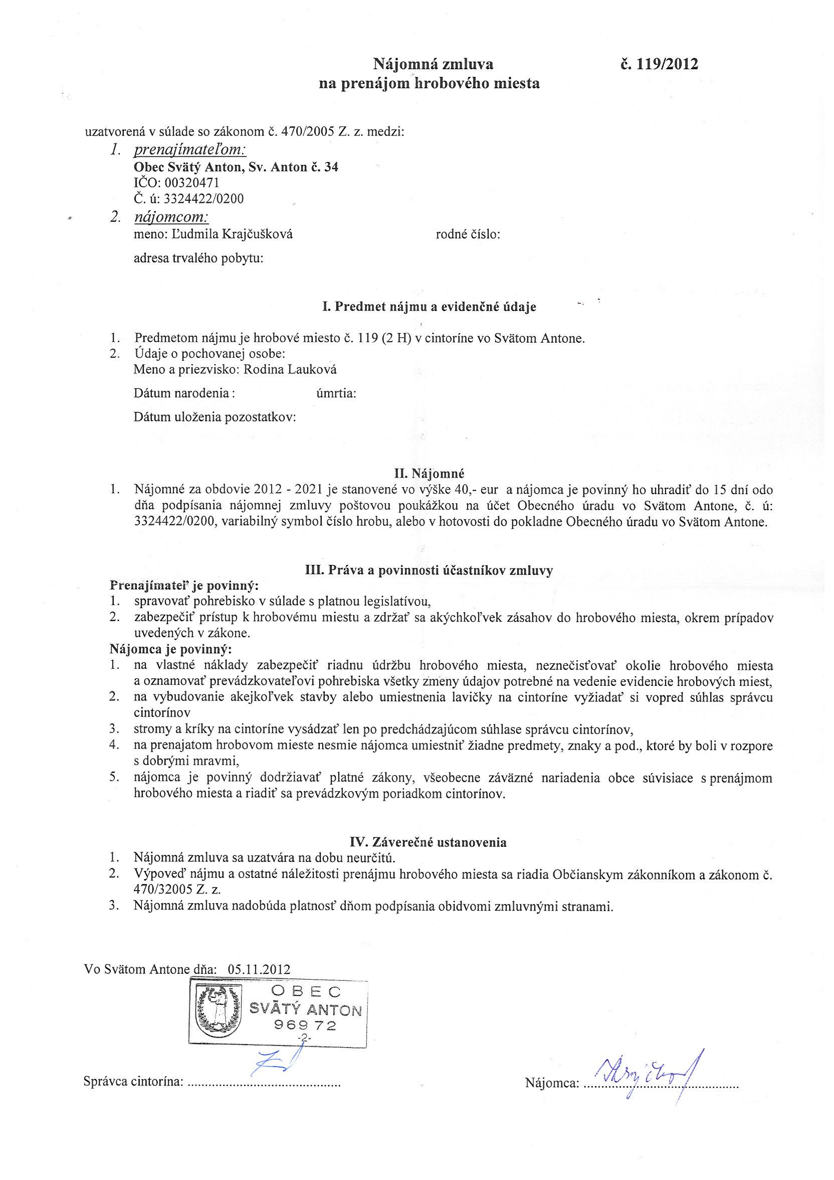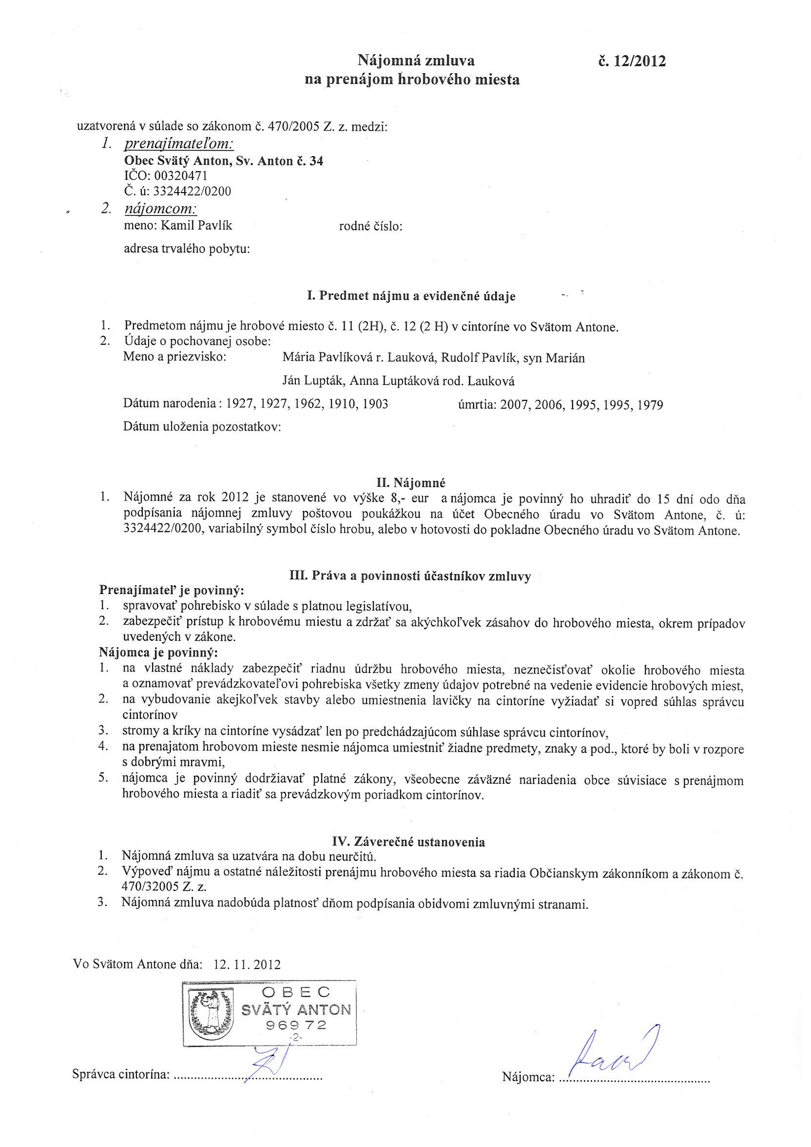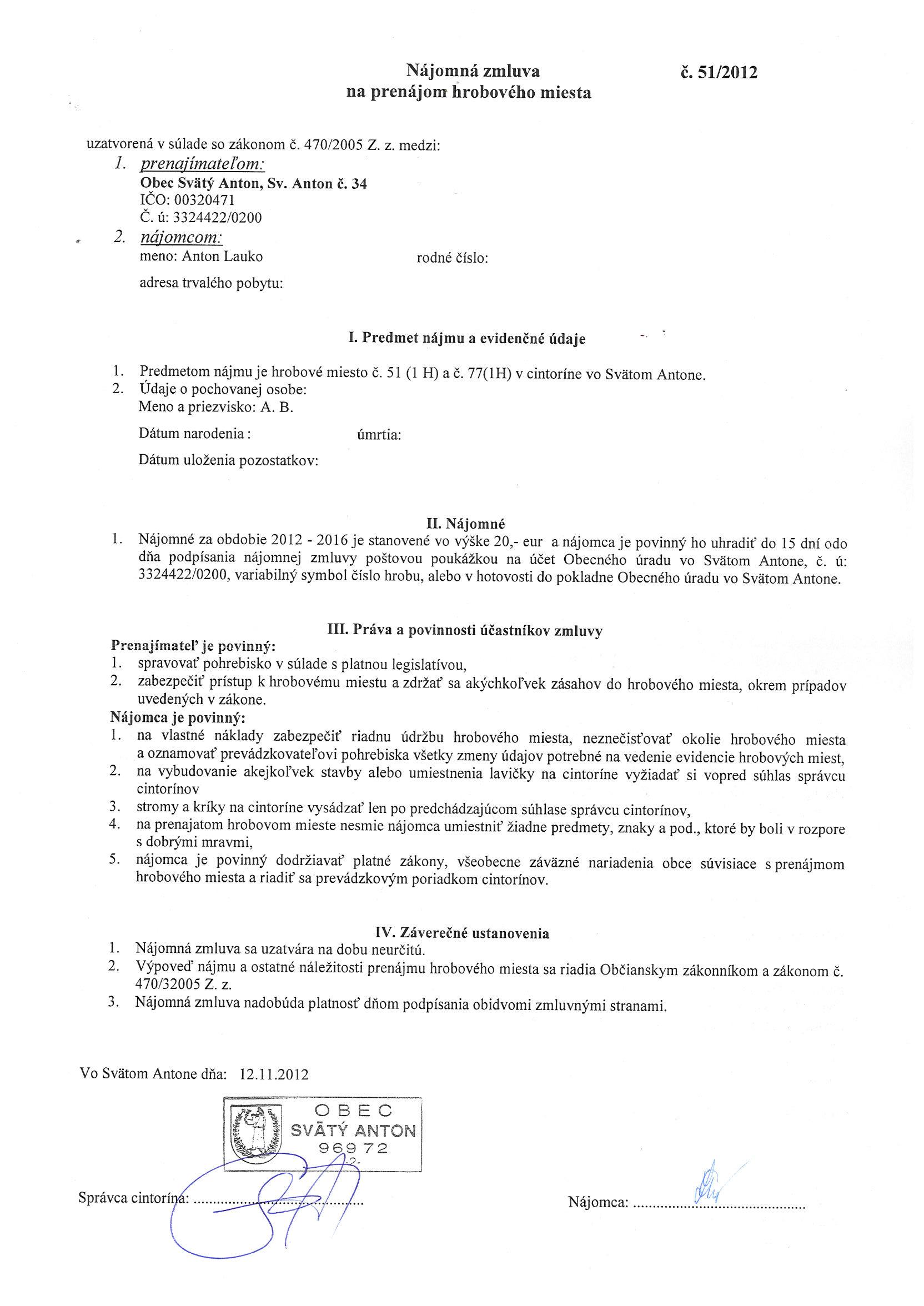 51/2012, Anton Lauko, Prenájom hrobového miesta |