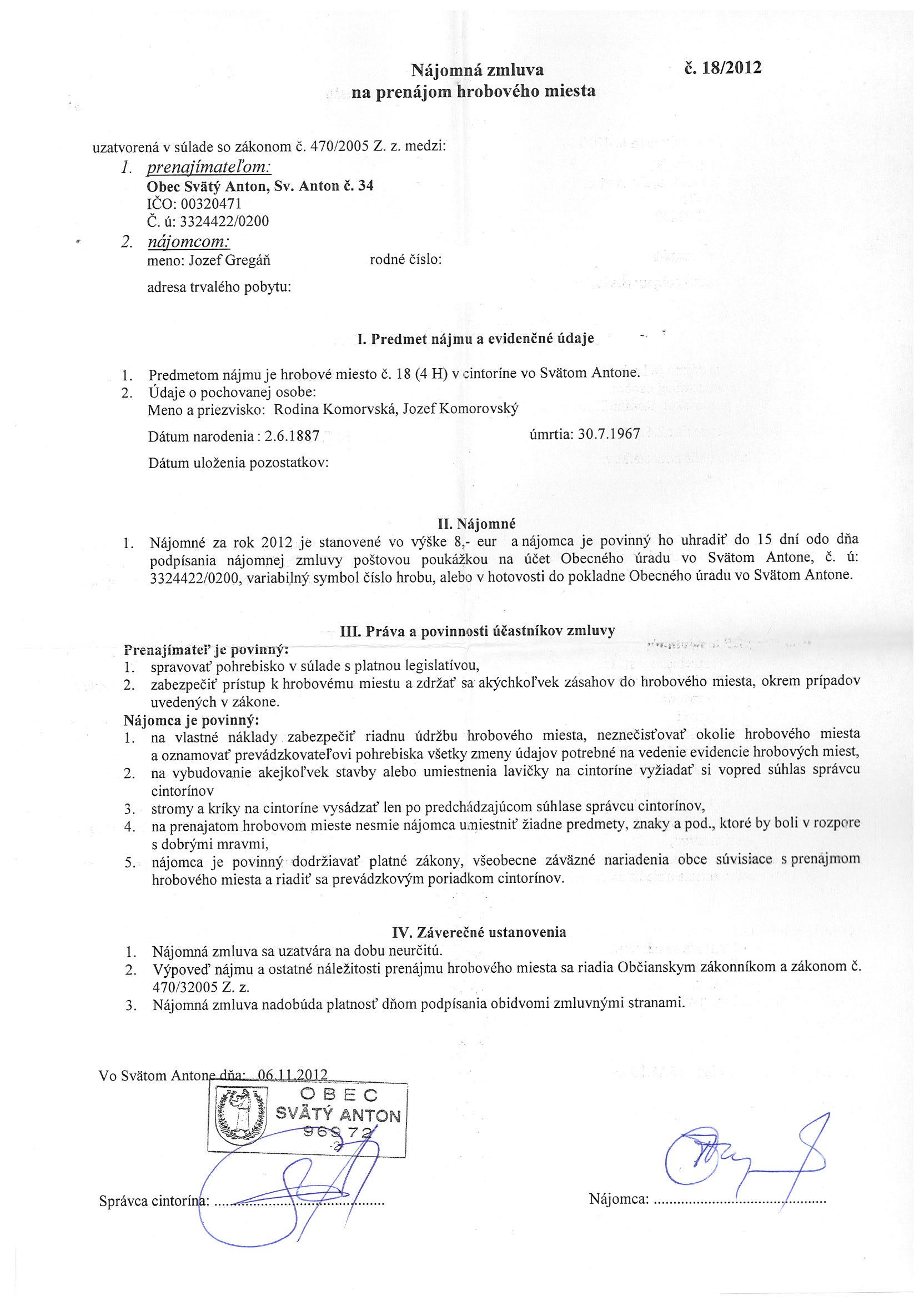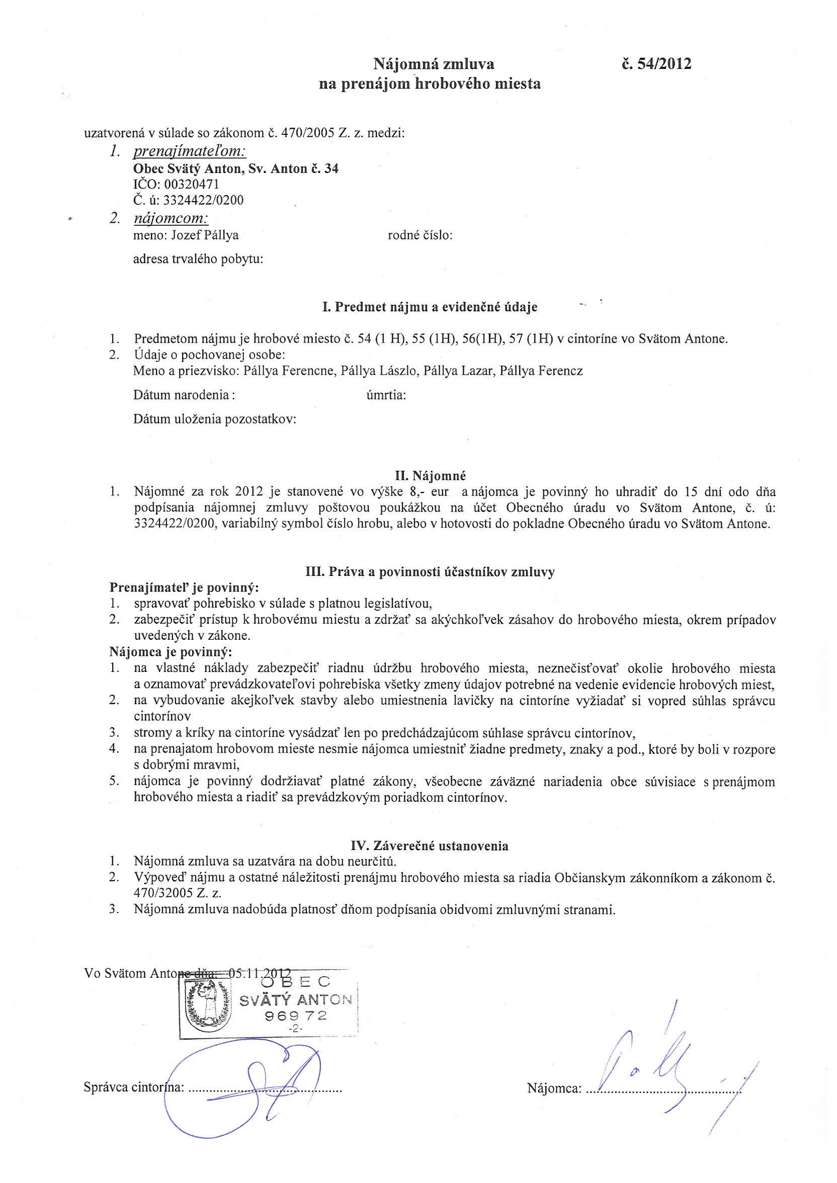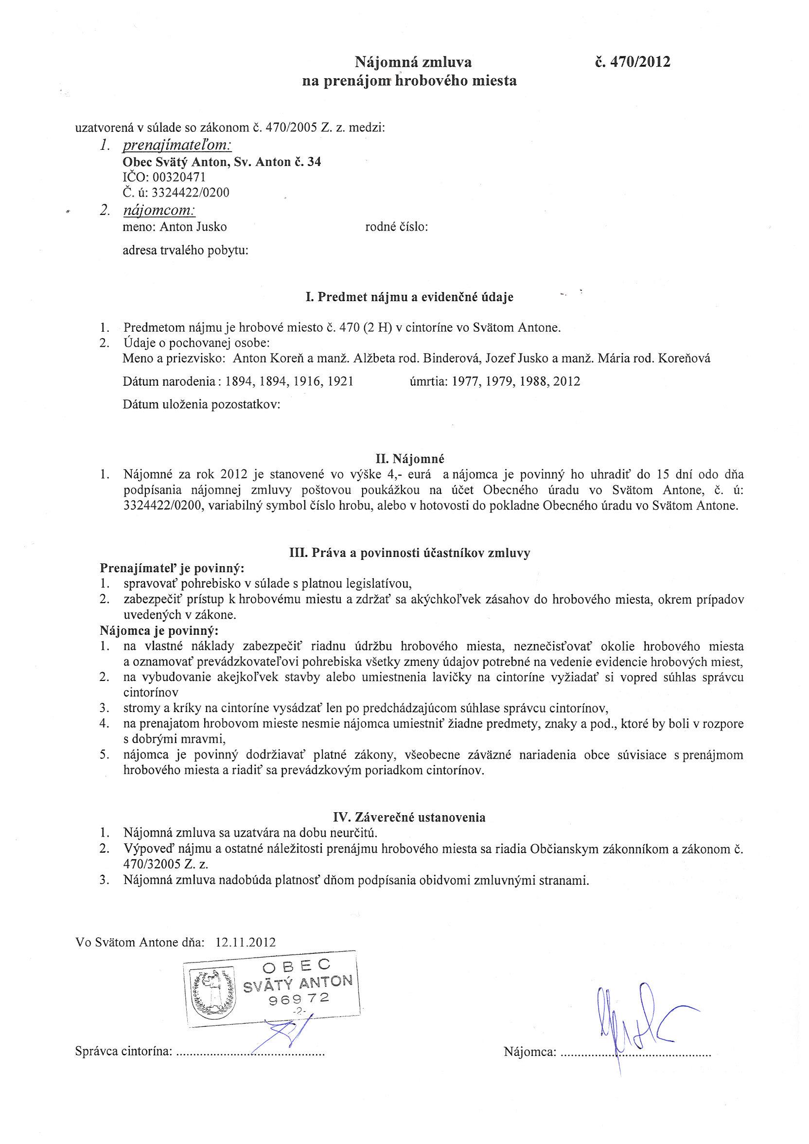 470/2012, Anton Jusko, Prenájom hrobového miesta |