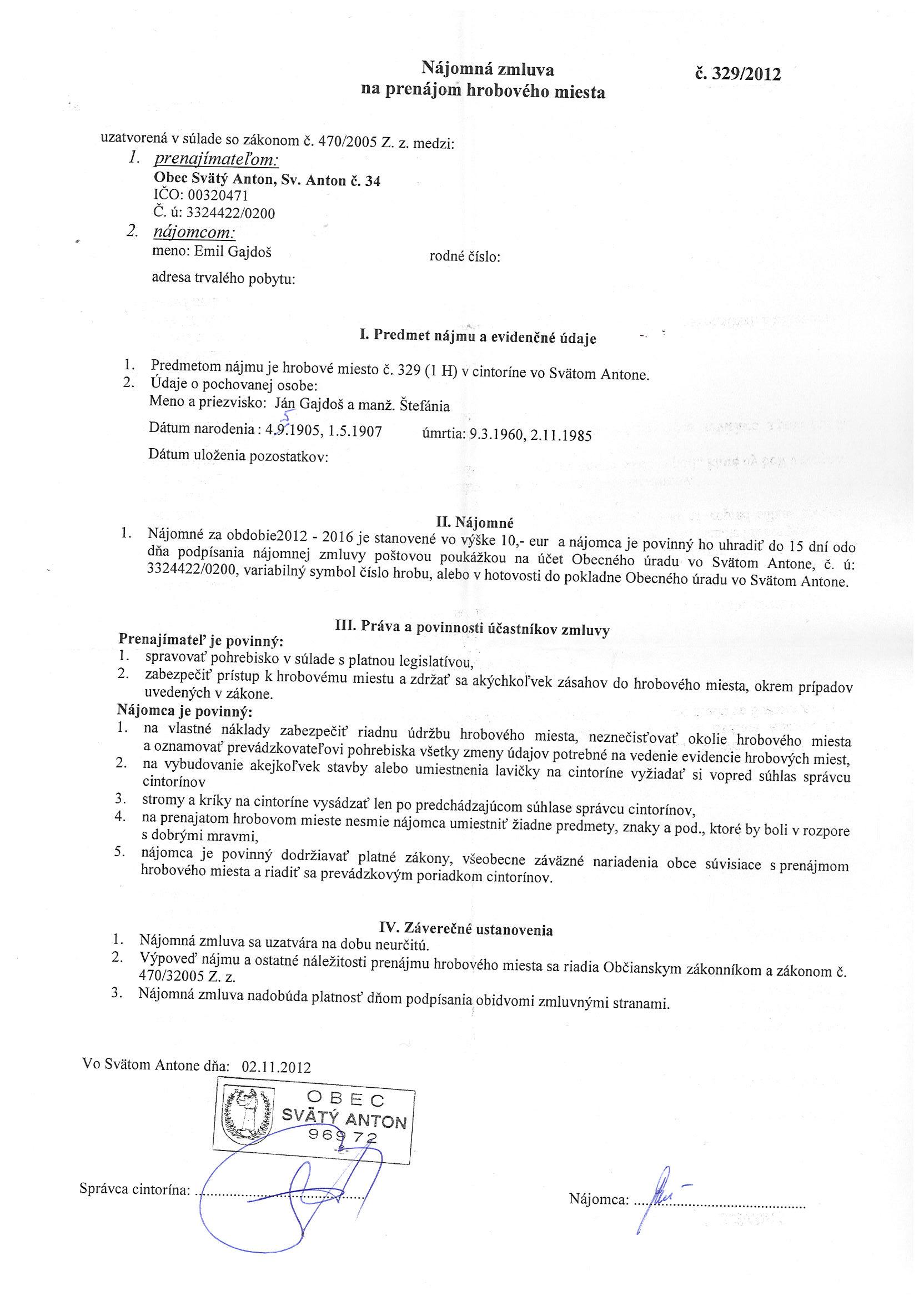 329/2012, Emil Gajdoš, Prenájom hrobového miesta |
