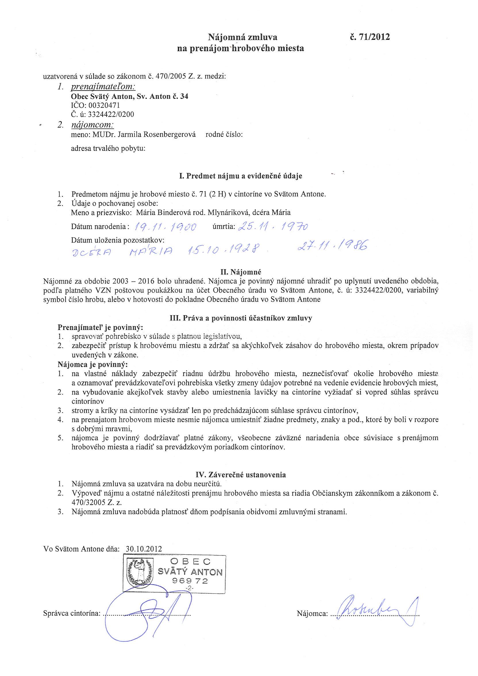 71/2012, MUDr. Jarmila Rosenbergerová, Prenájom hrobového miesta |