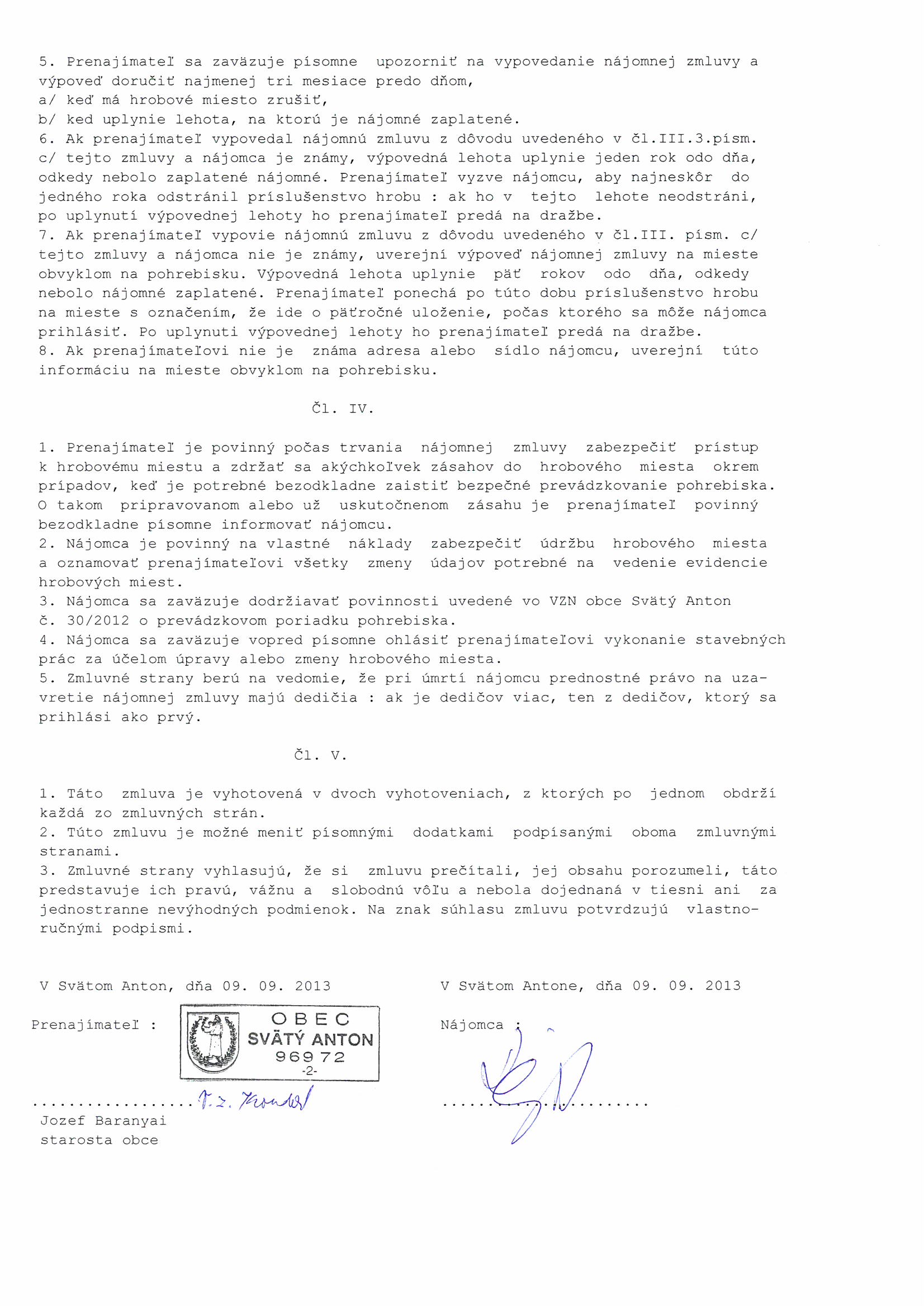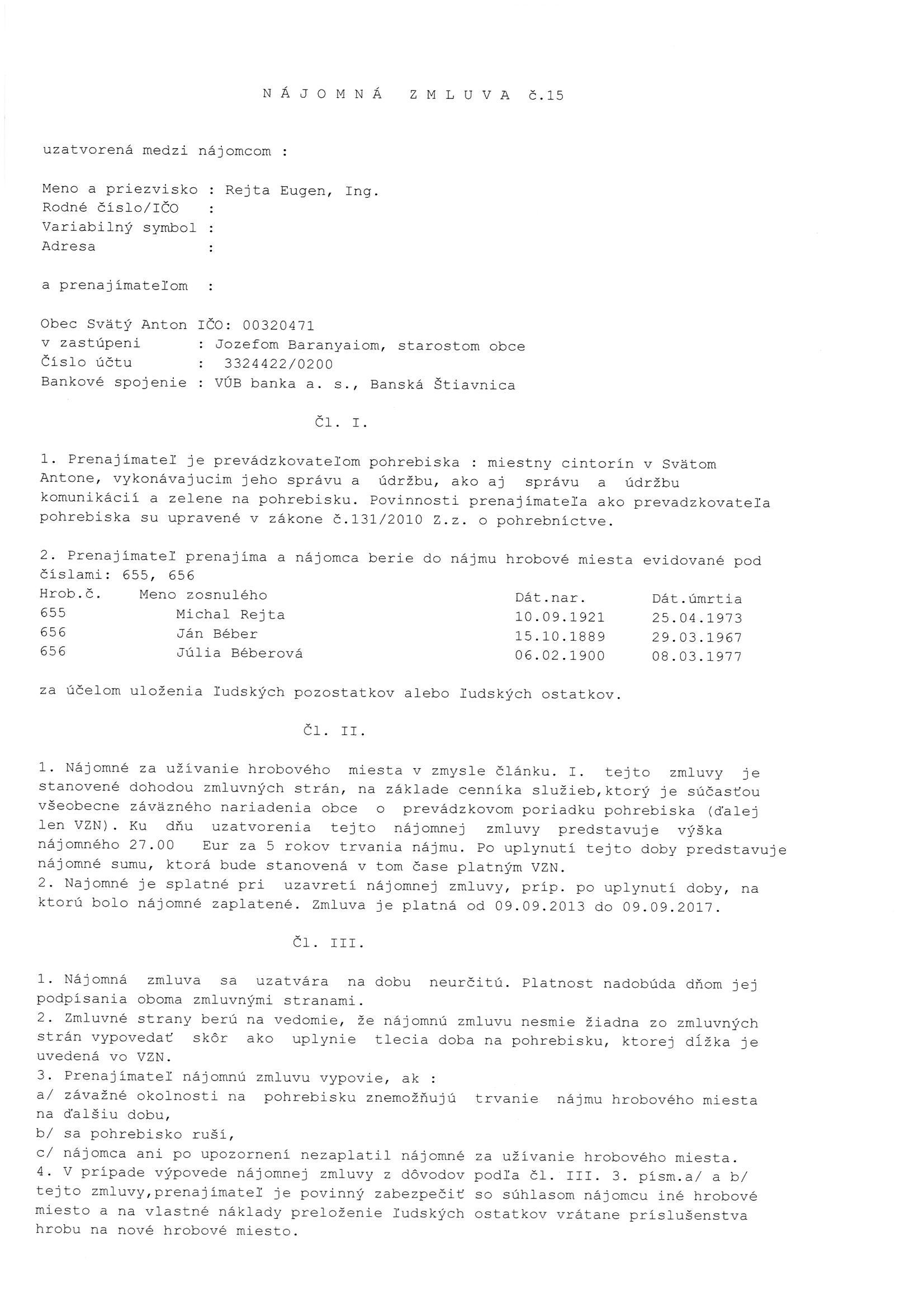 15/2013, Ing. Eugen Rejta, Zmluva o prenájme hrobových miest. |