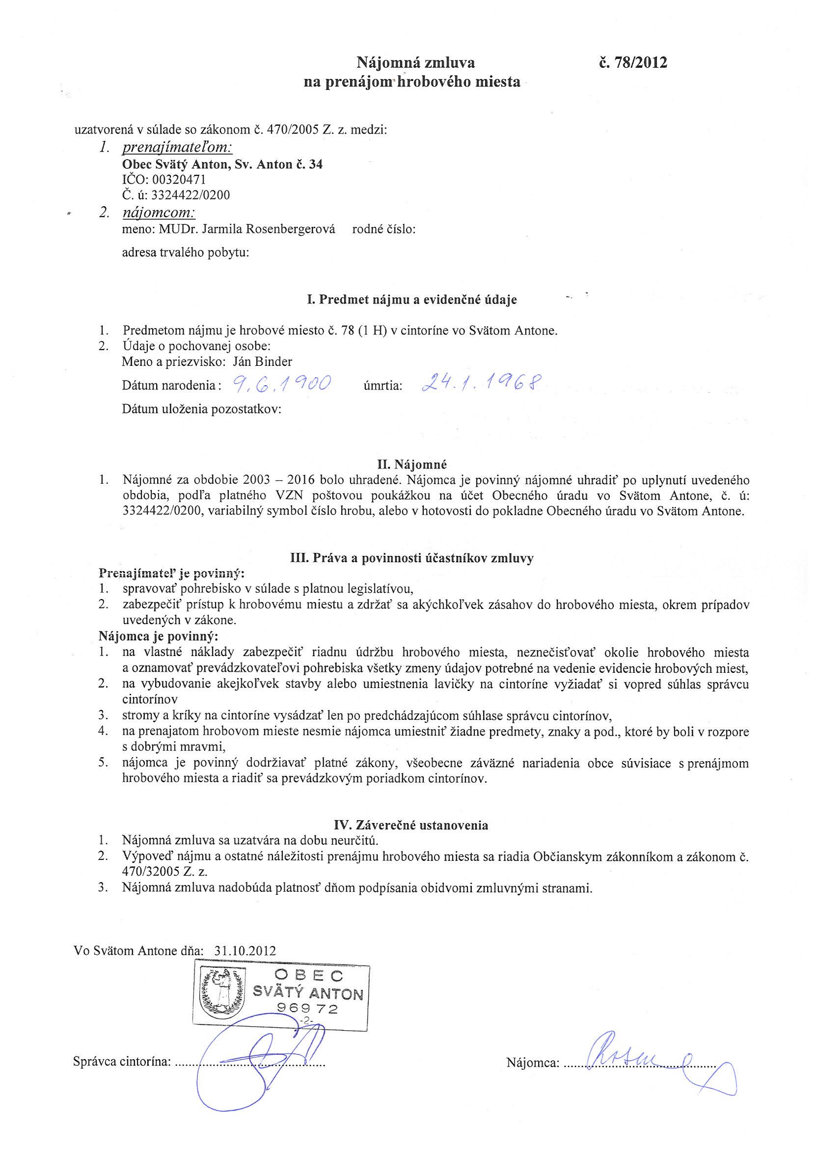 78/2012, MUDr. Jarmila Rosenbergerová, Prenájom hrobového miesta |