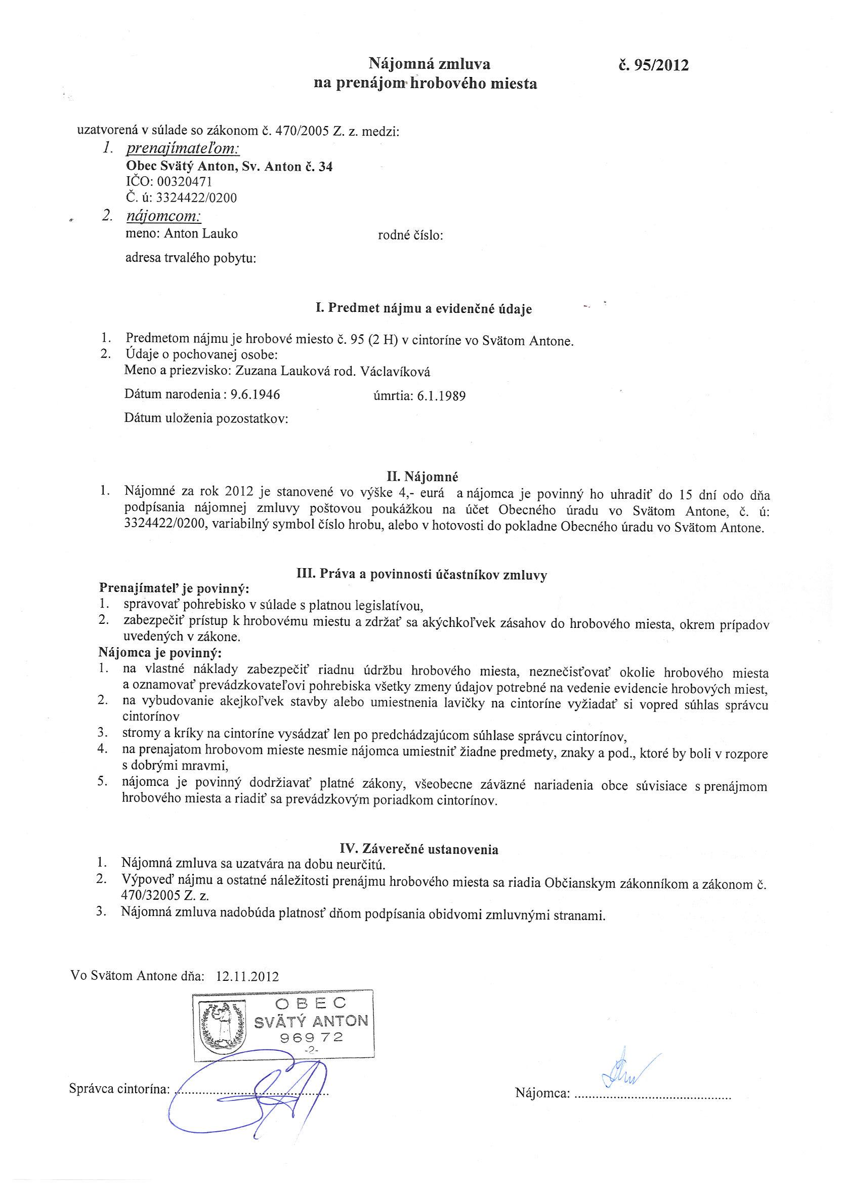95/2012, Anton Lauko, Prenájom hrobového miesta |