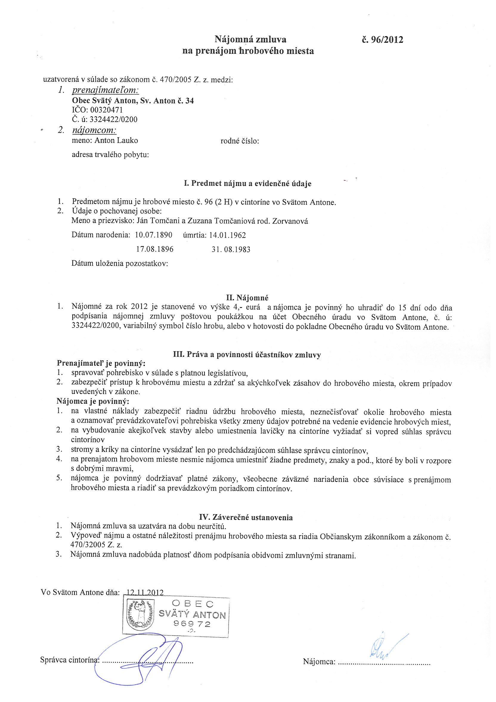 96/2012, Anton Lauko, Prenájom hrobového miesta |