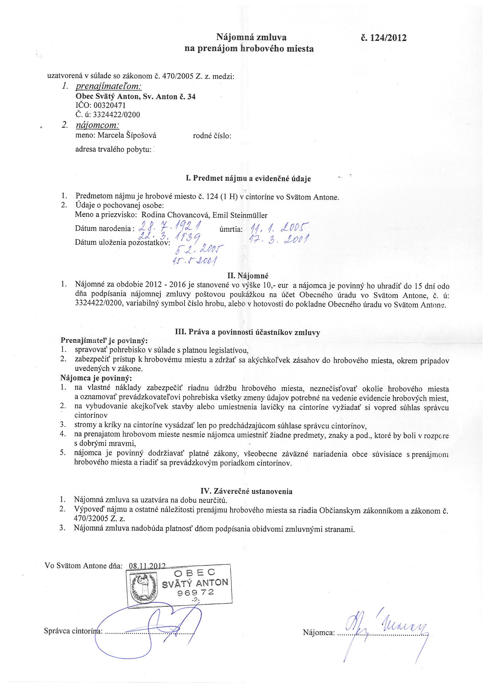 124/2012, Marcela Šípošová, Prenájom hrobového miesta |