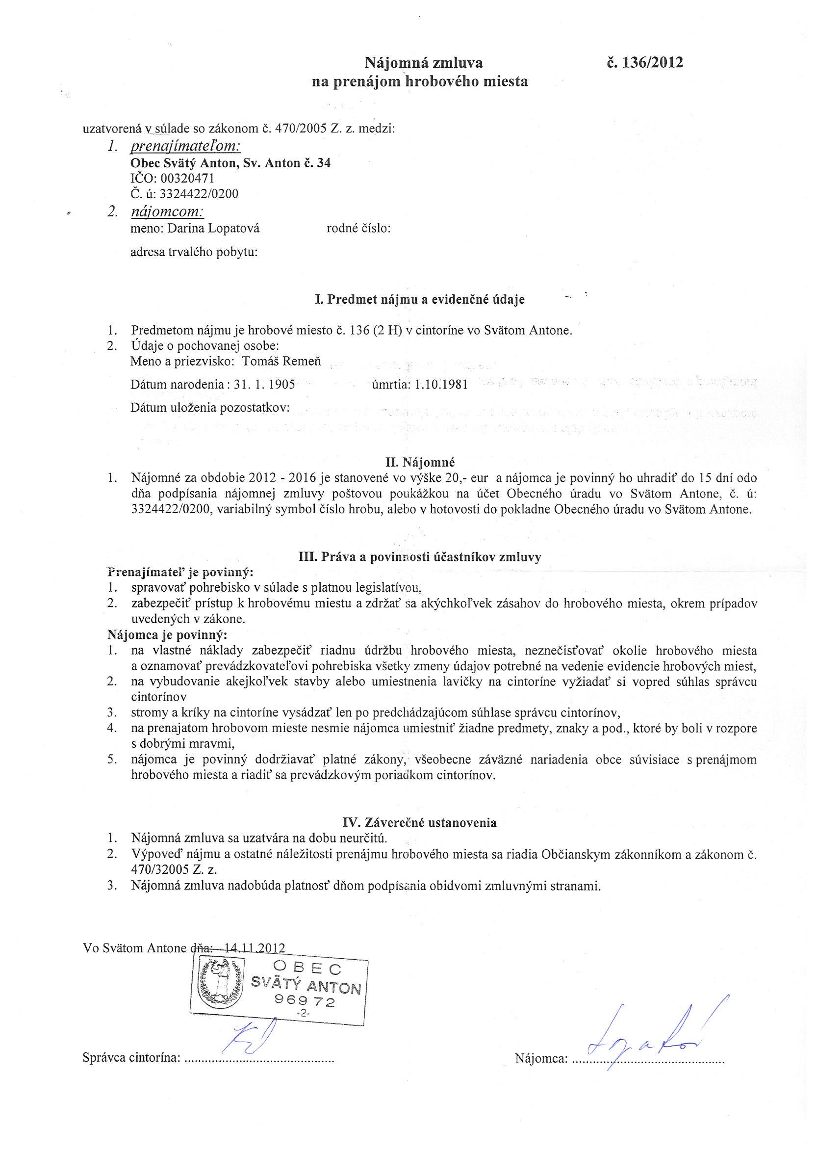 136/2012, Darina Lopatová, Prenájom hrobového miesta |