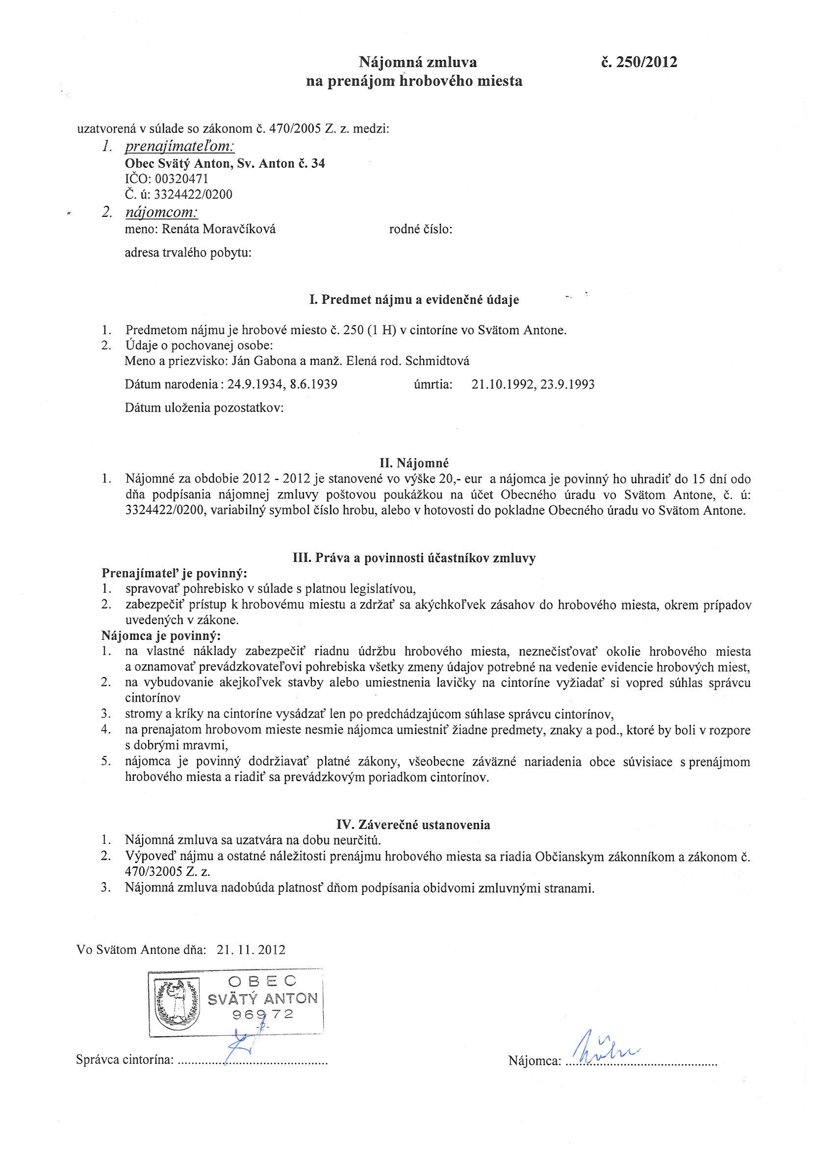 250/2012, Renáta Moravčíková, Prenájom hrobového miesta |