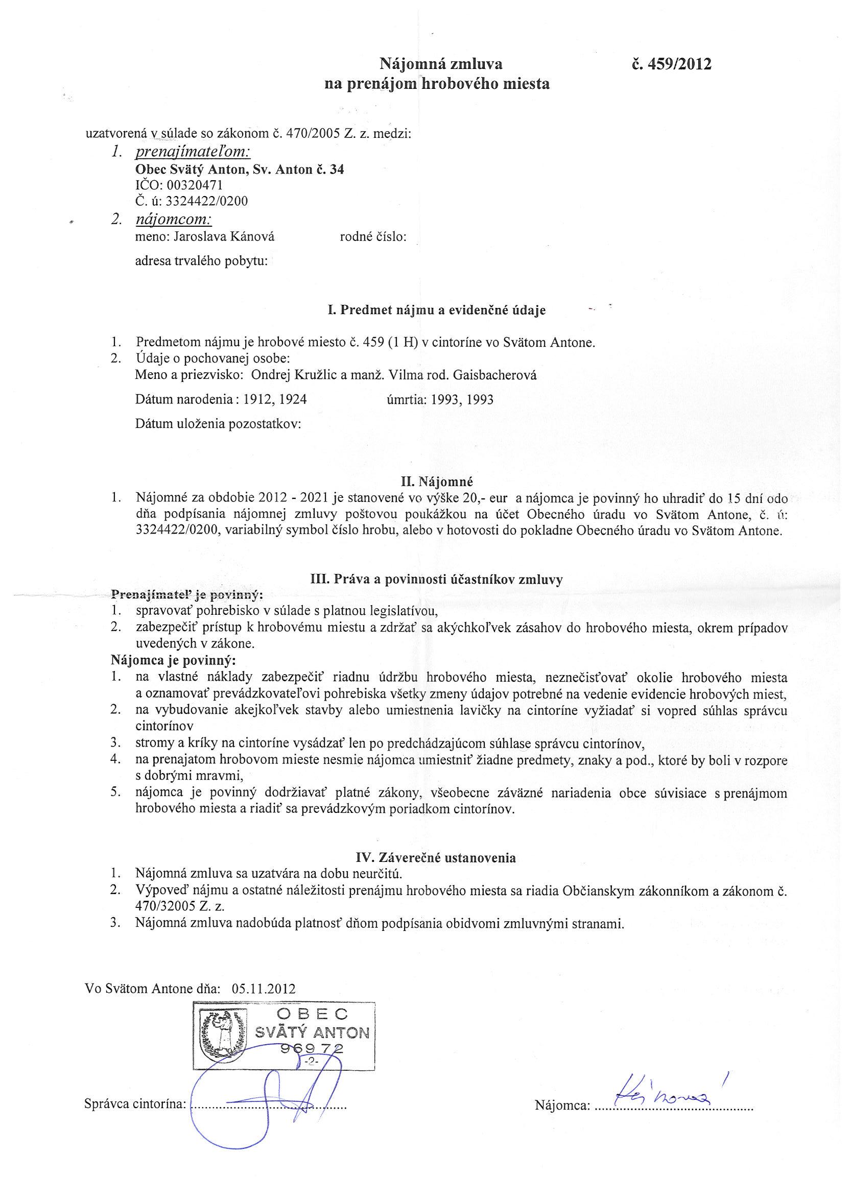 459/2012, Jaroslava Kánová, Prenájom hrobového miesta |