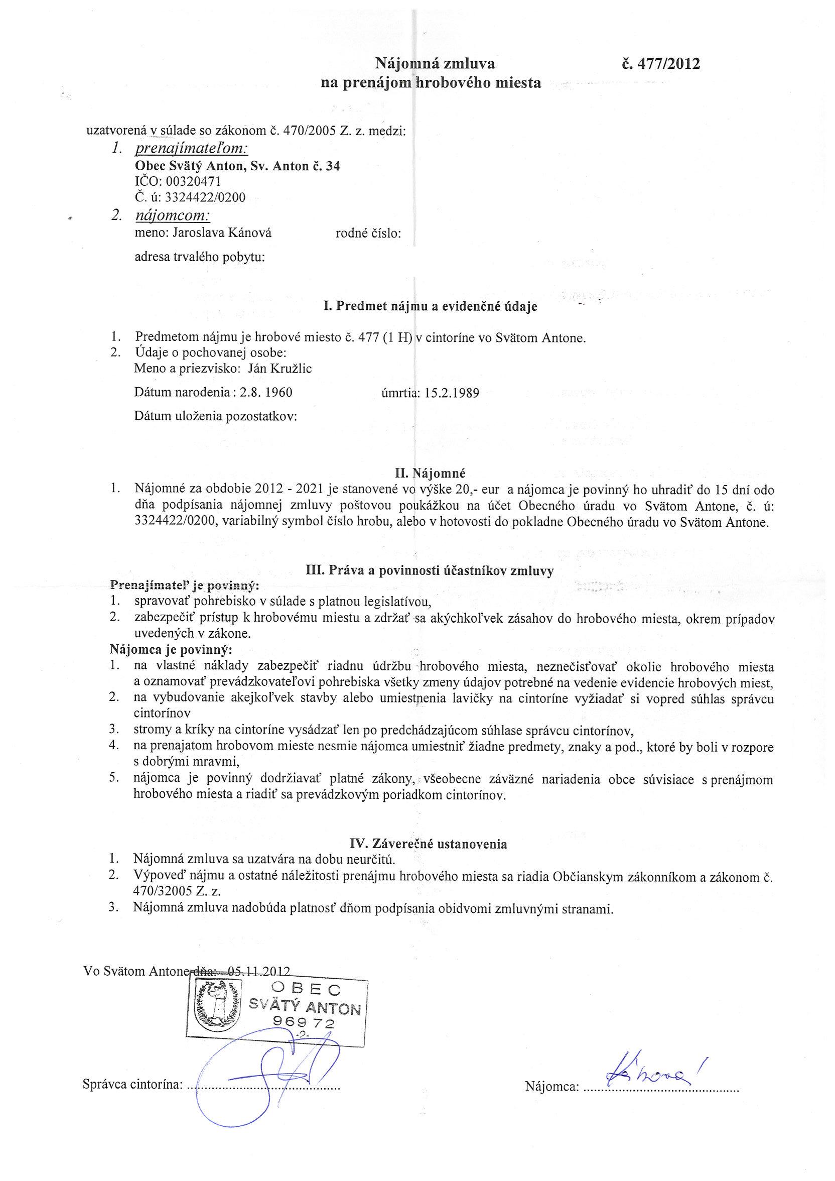 477/2012, Jaroslava Kánová, Prenájom hrobového miesta |