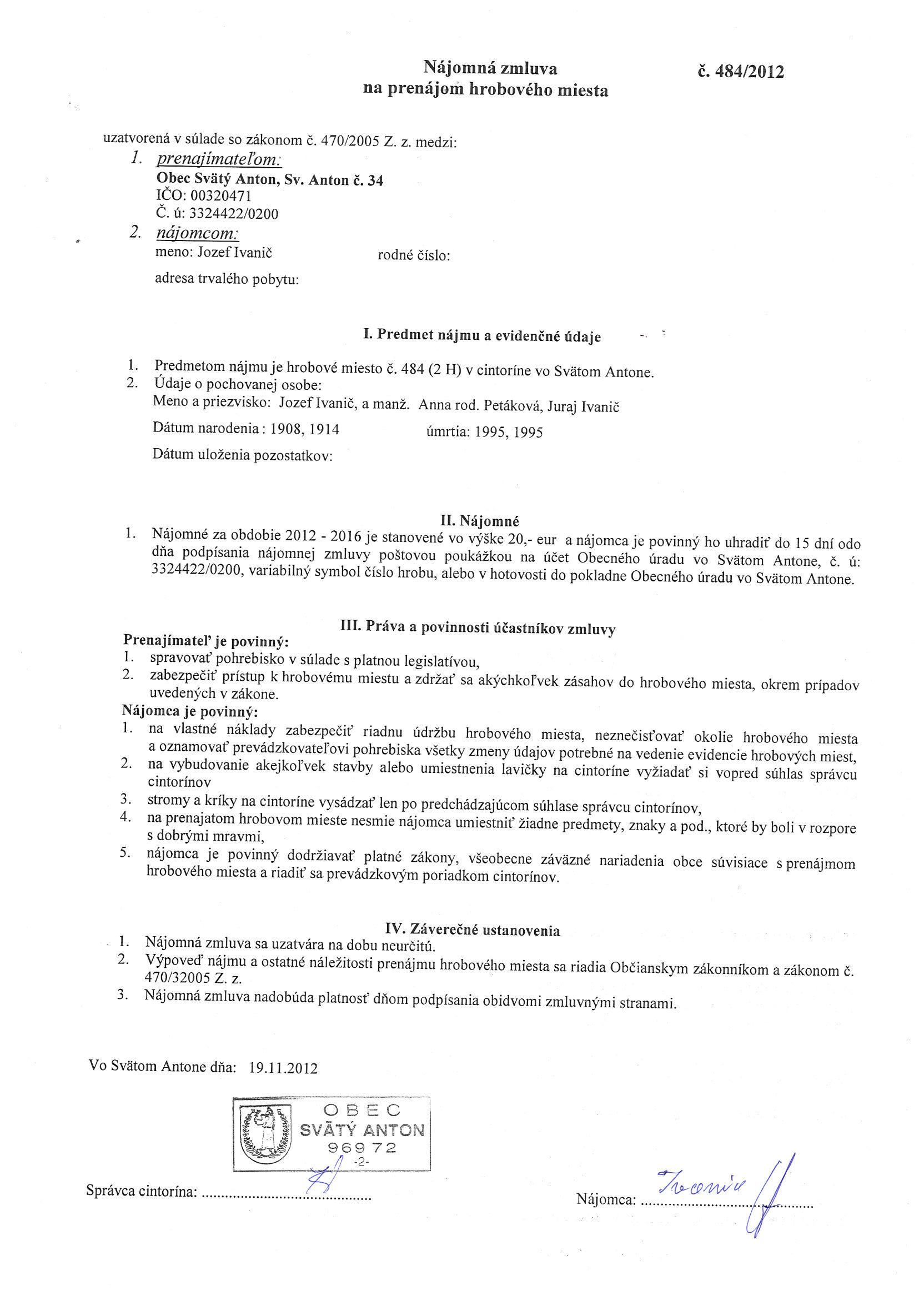 484/2012, Jozef Ivanič, Prenájom hrobového miesta |