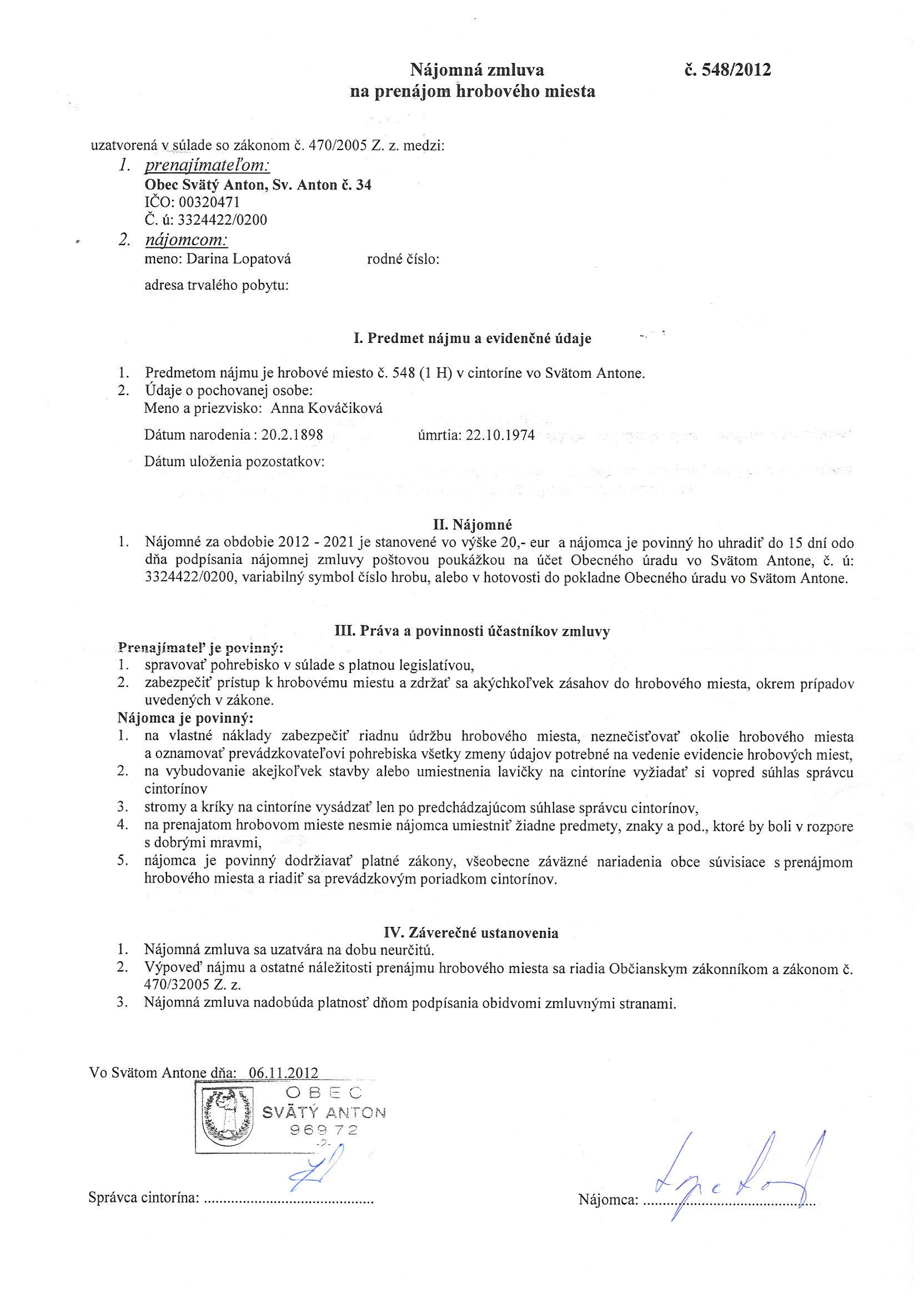 548/2012, Darina Lopatová, Prenájom hrobového miesta |