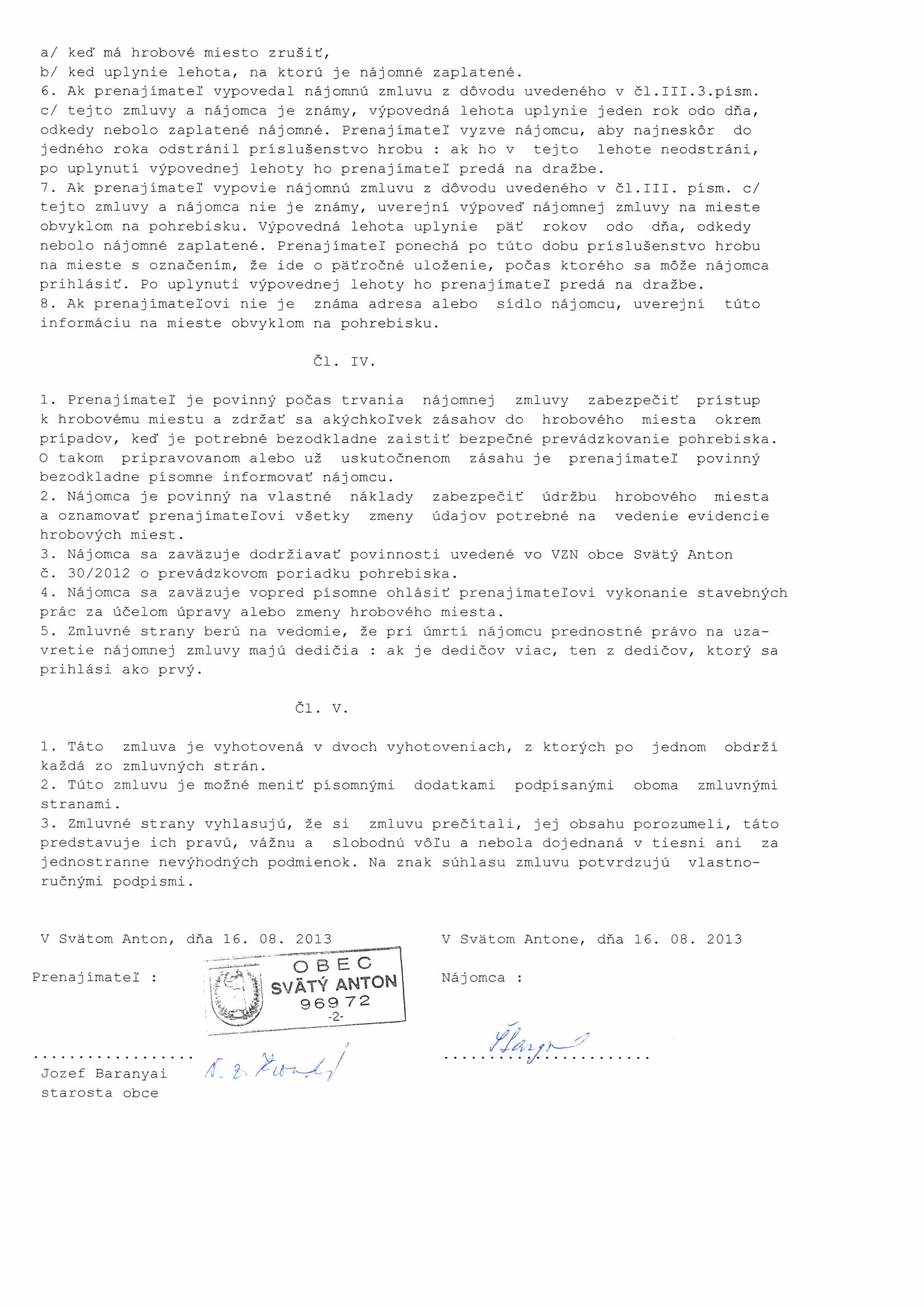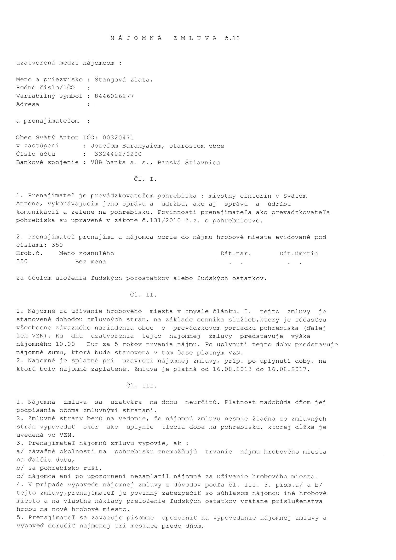 Z 13/2013, Zlata Štangová, Prenájom hrobového miesta |