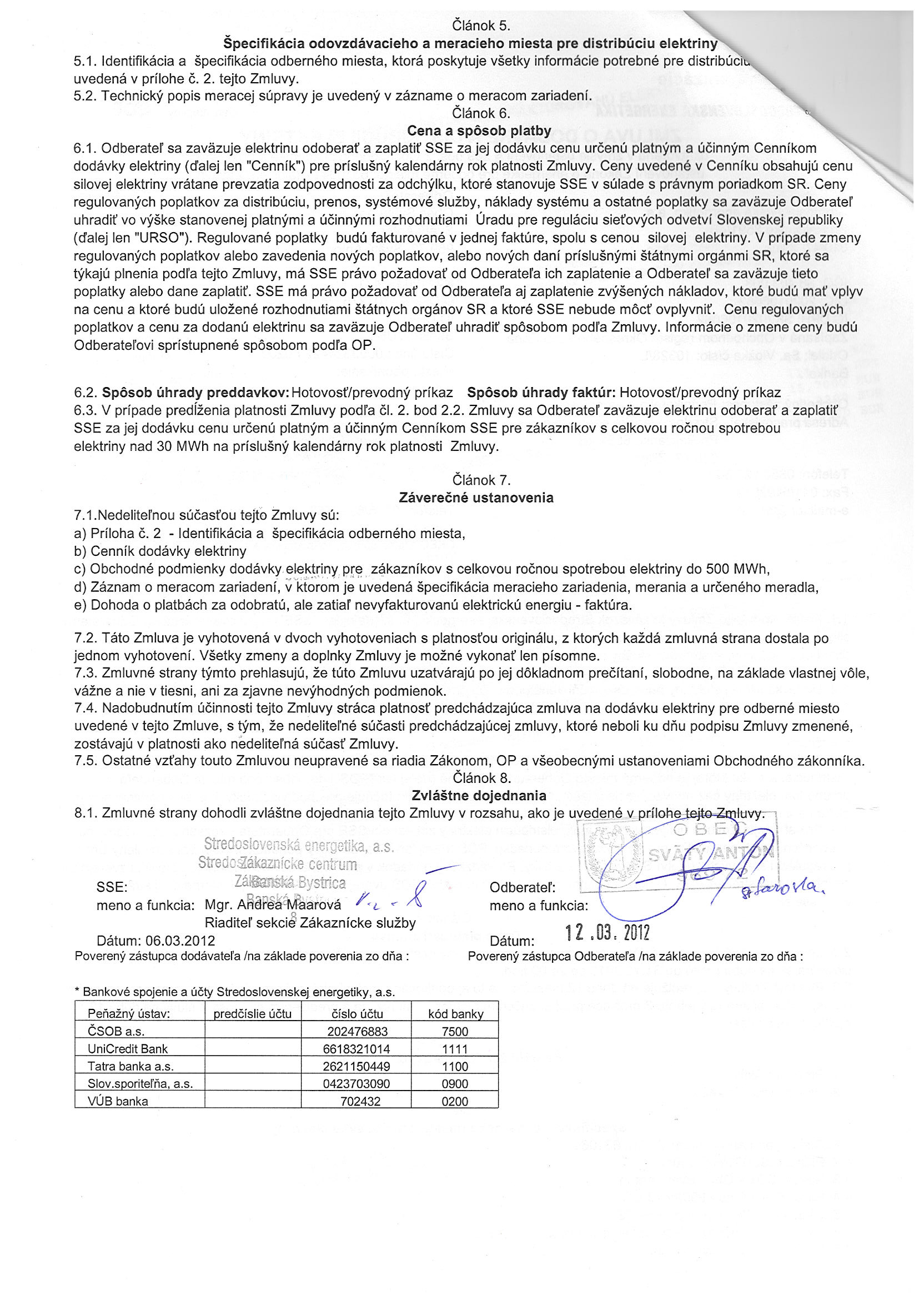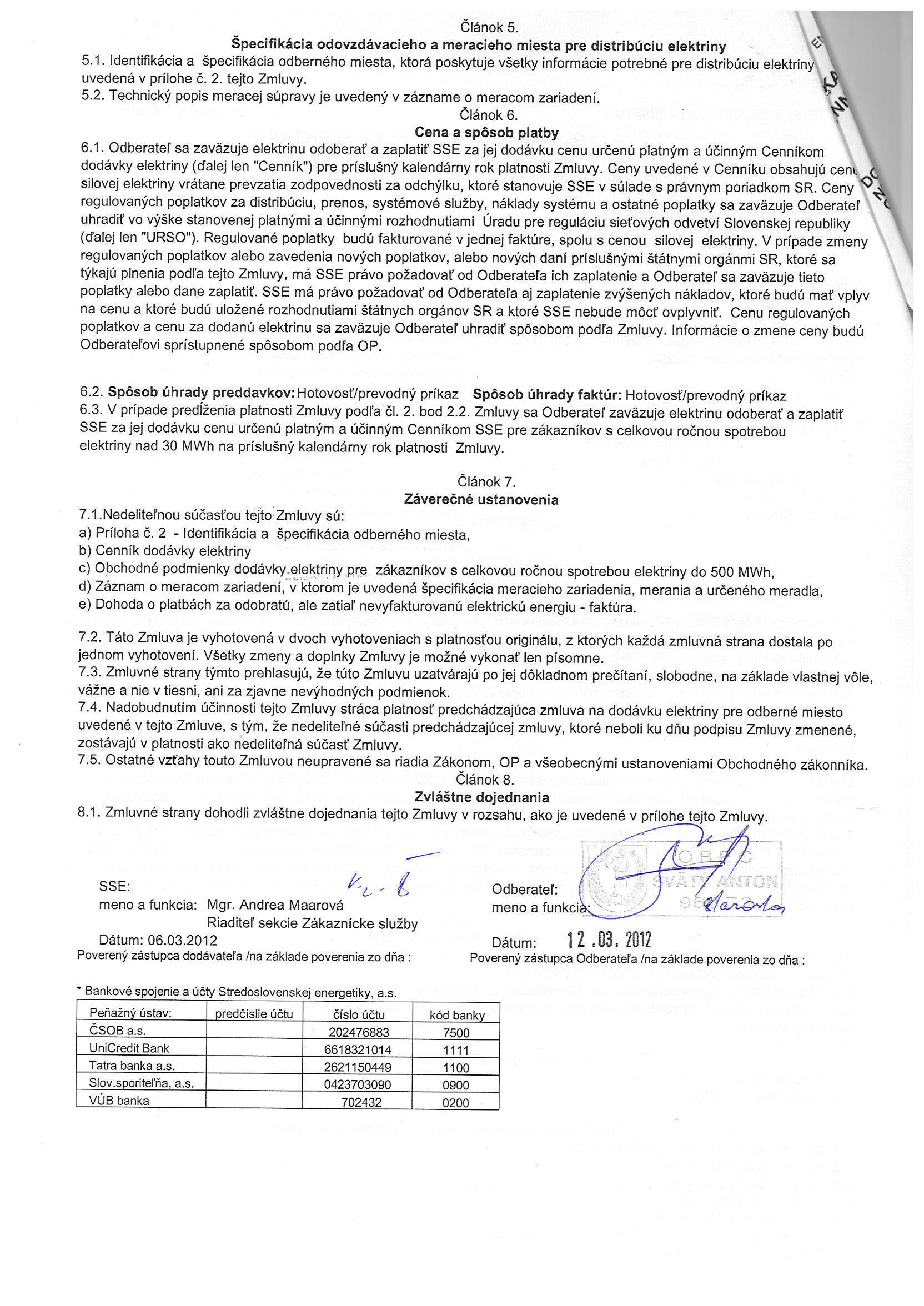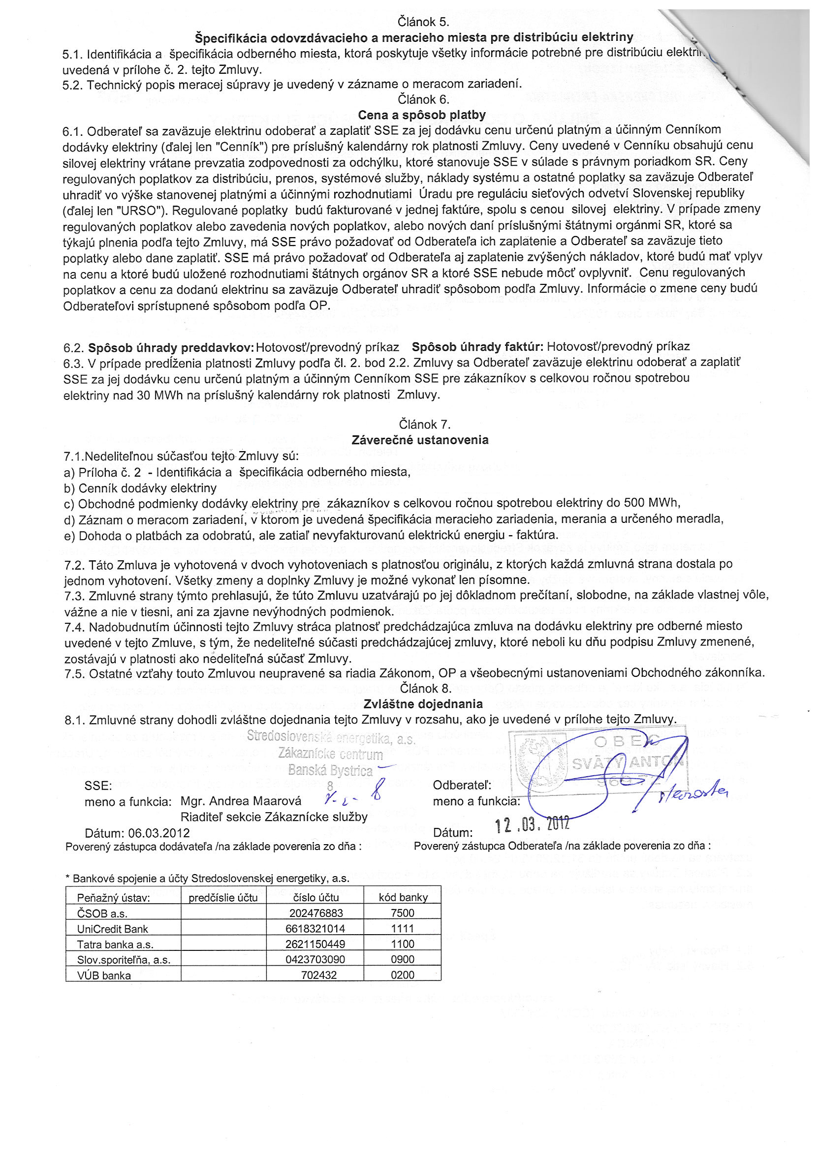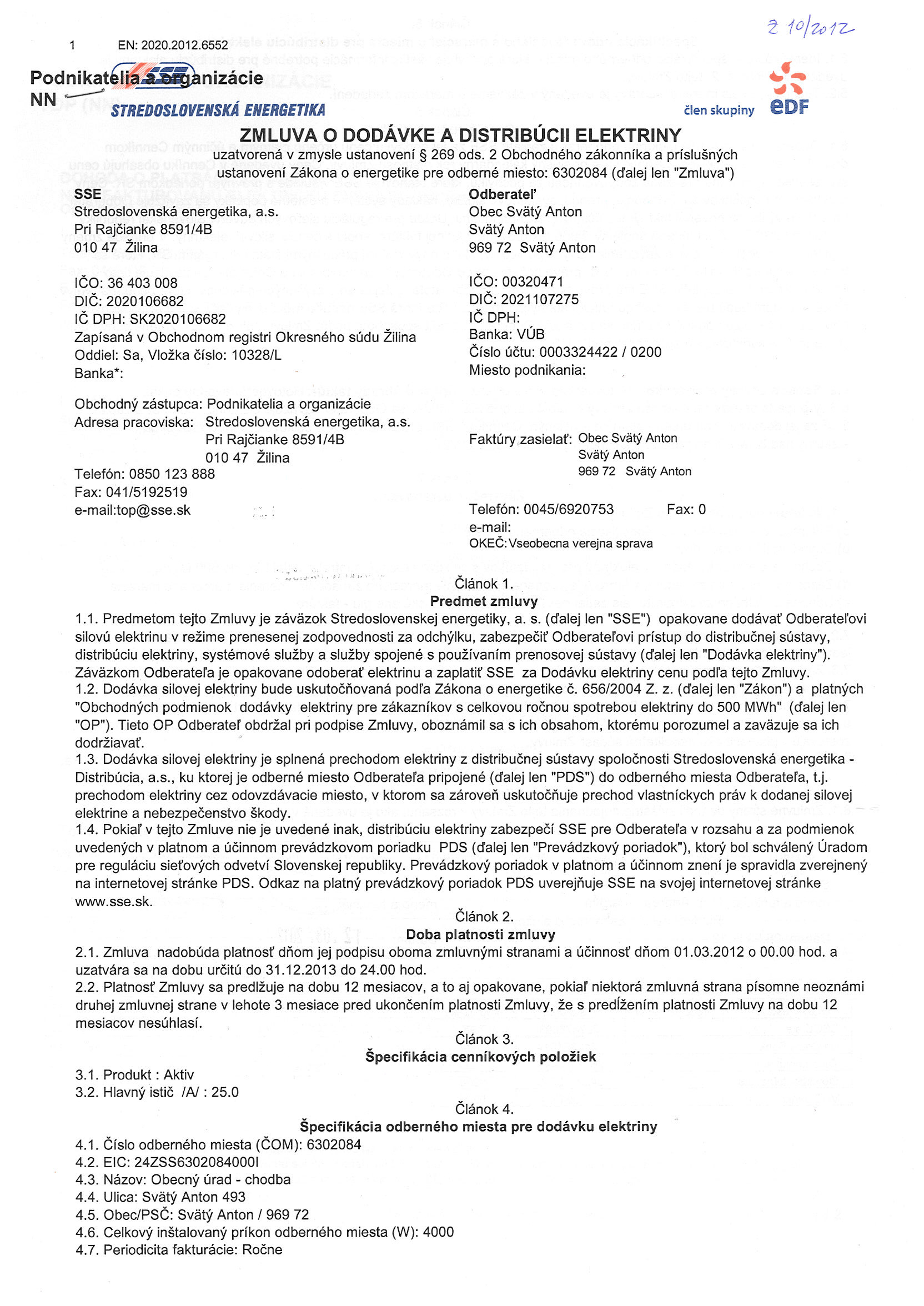 10/2012, Stredoslovenská energetika Žilina, Zmluva o dodávke a distribúcii elektriny - Obecný úrad |