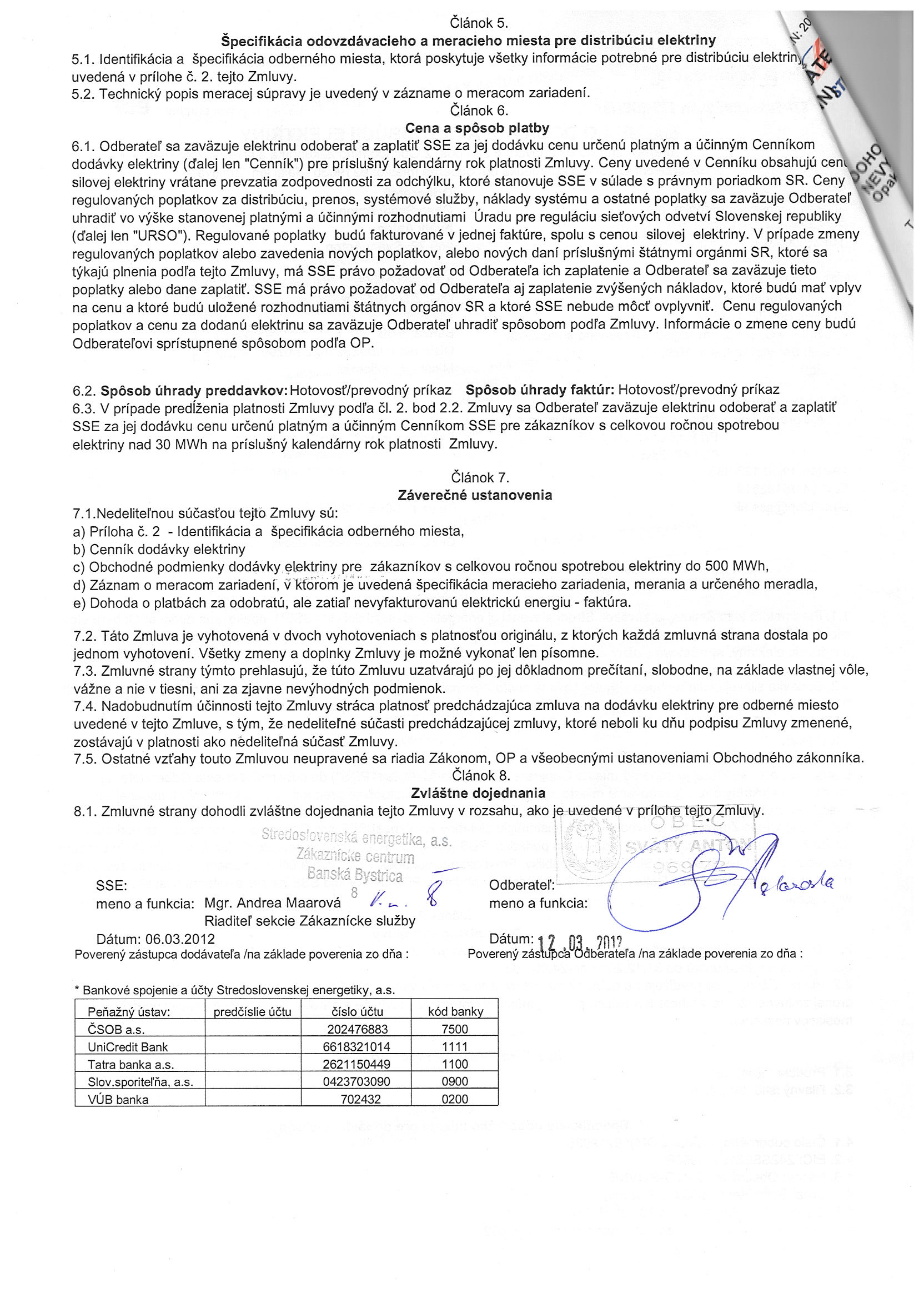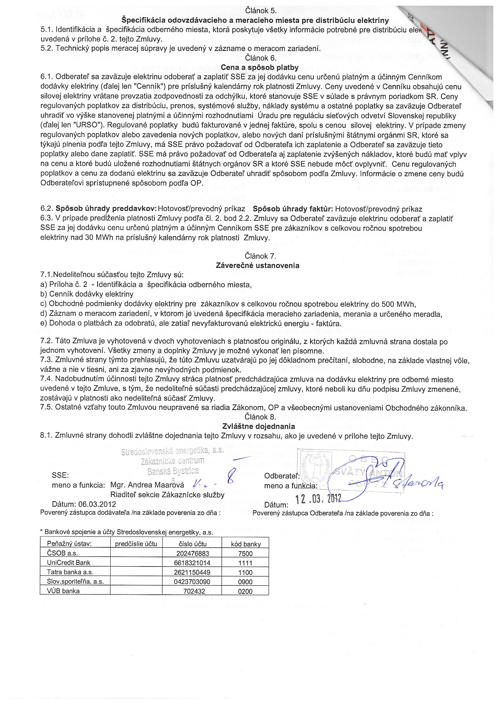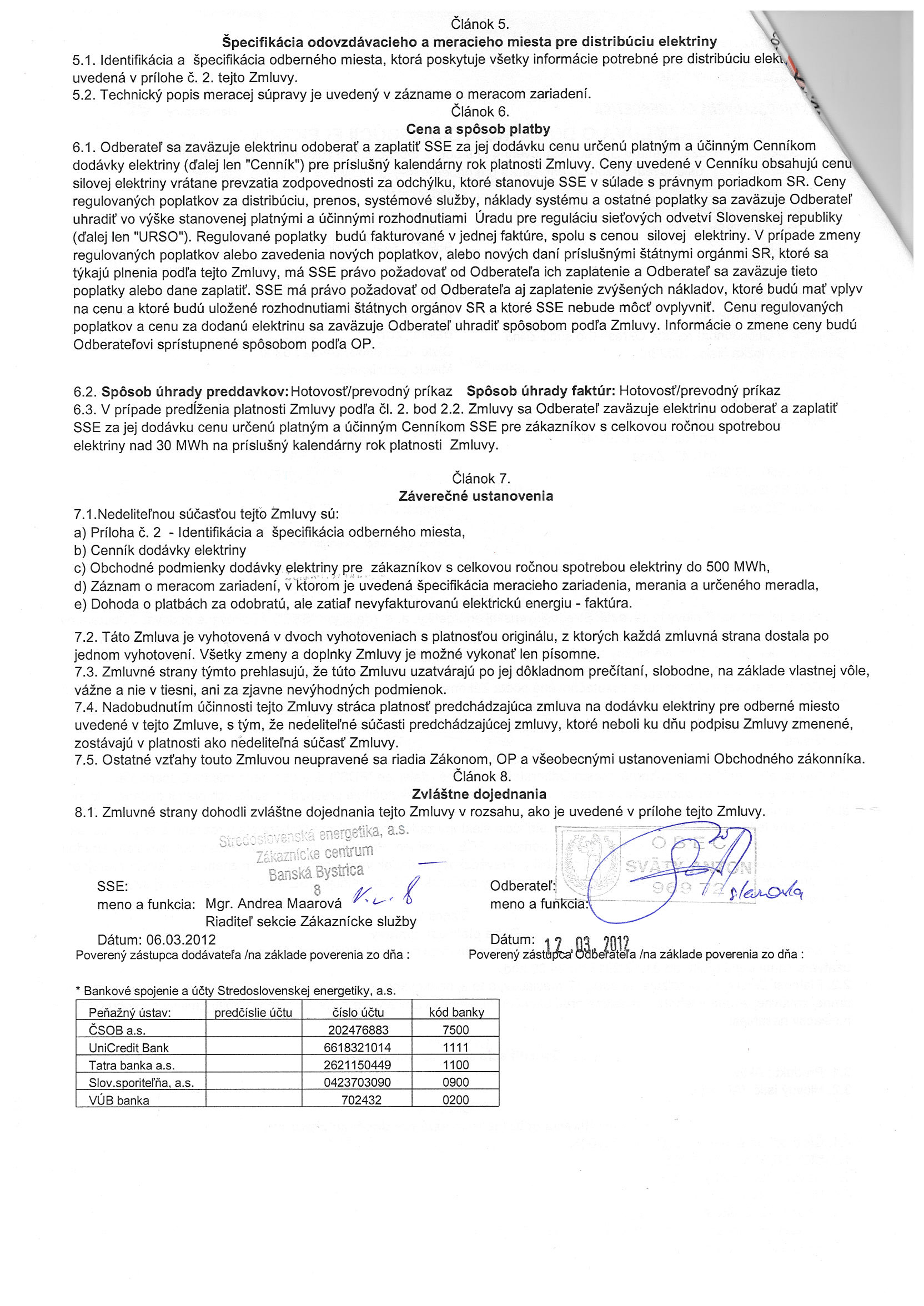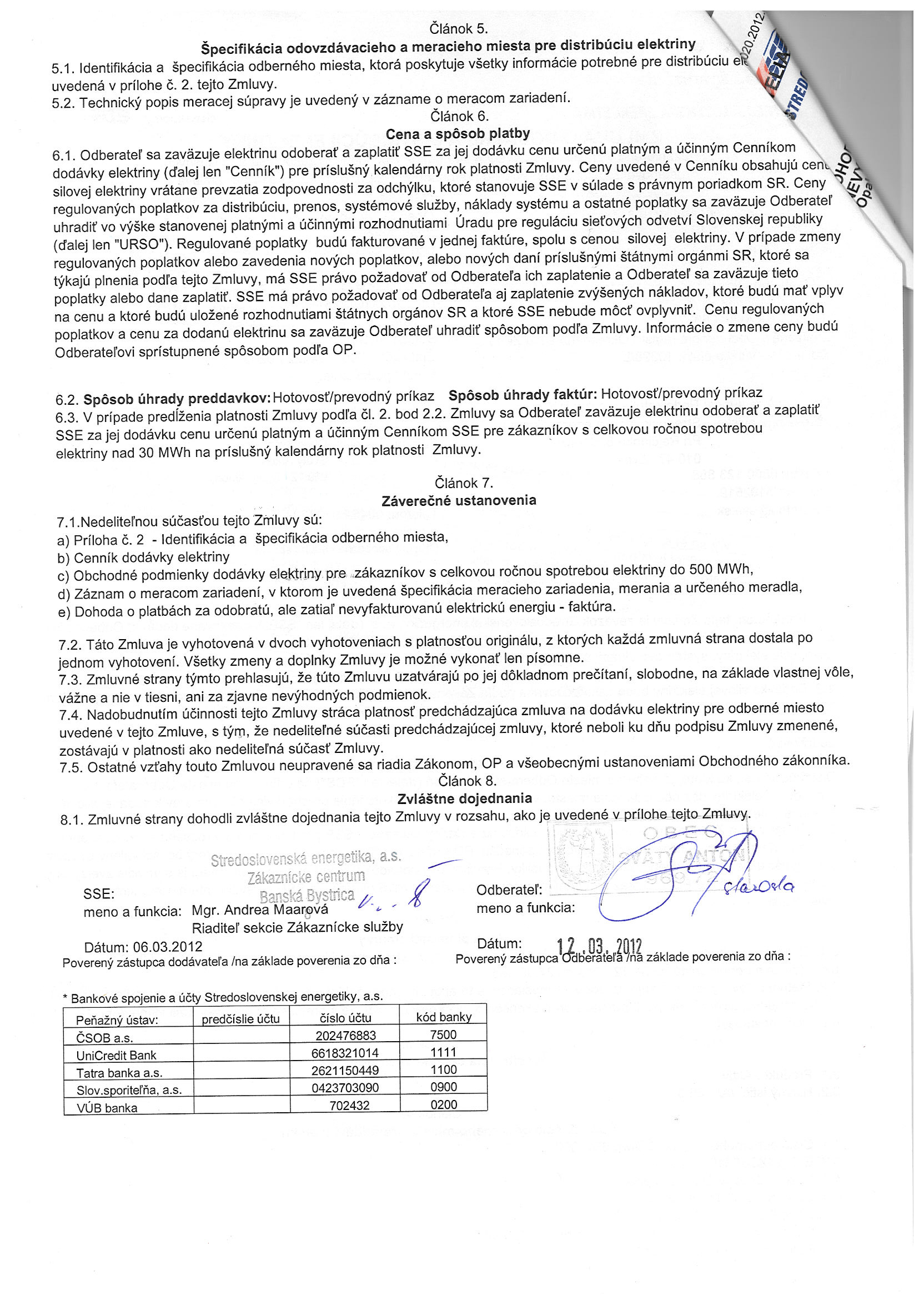 10/2012, Stredoslovenská energetika Žilina, Zmluva o dodávke a distribúcii elektriny - Obecný úrad |