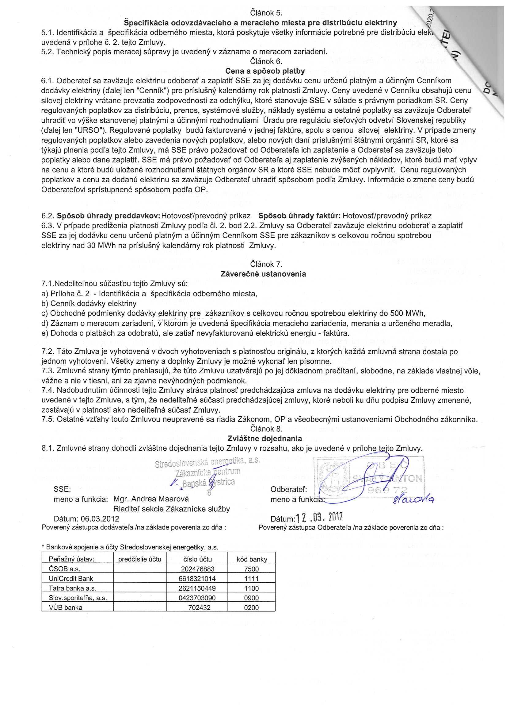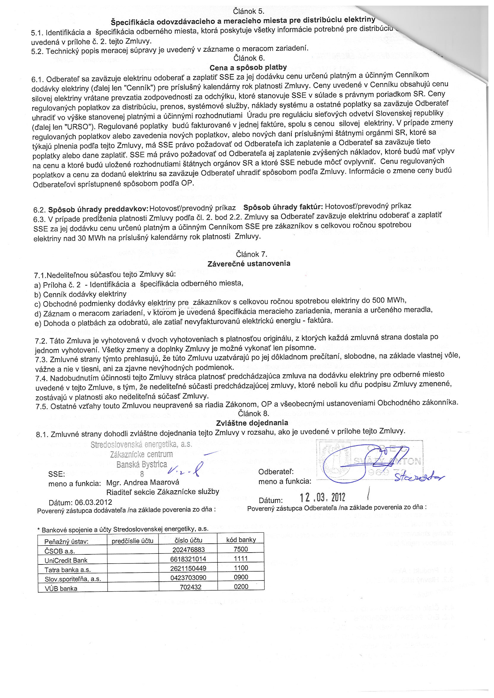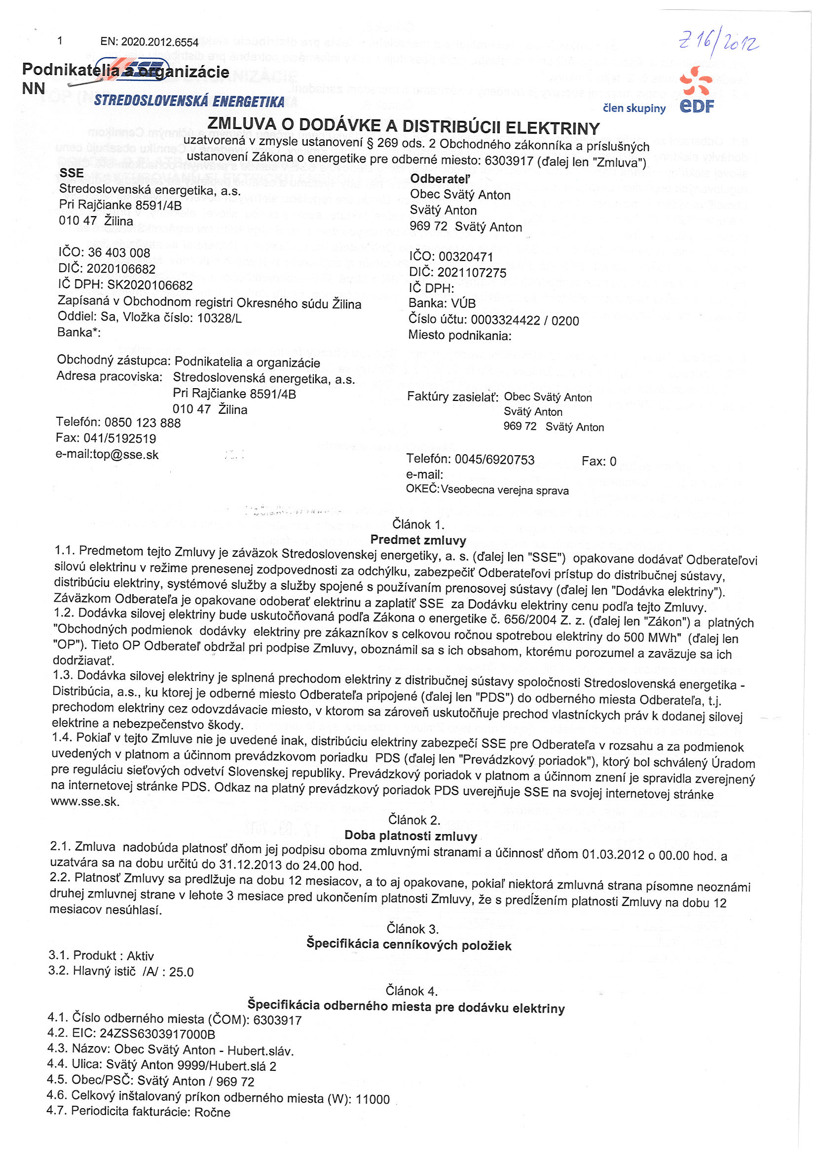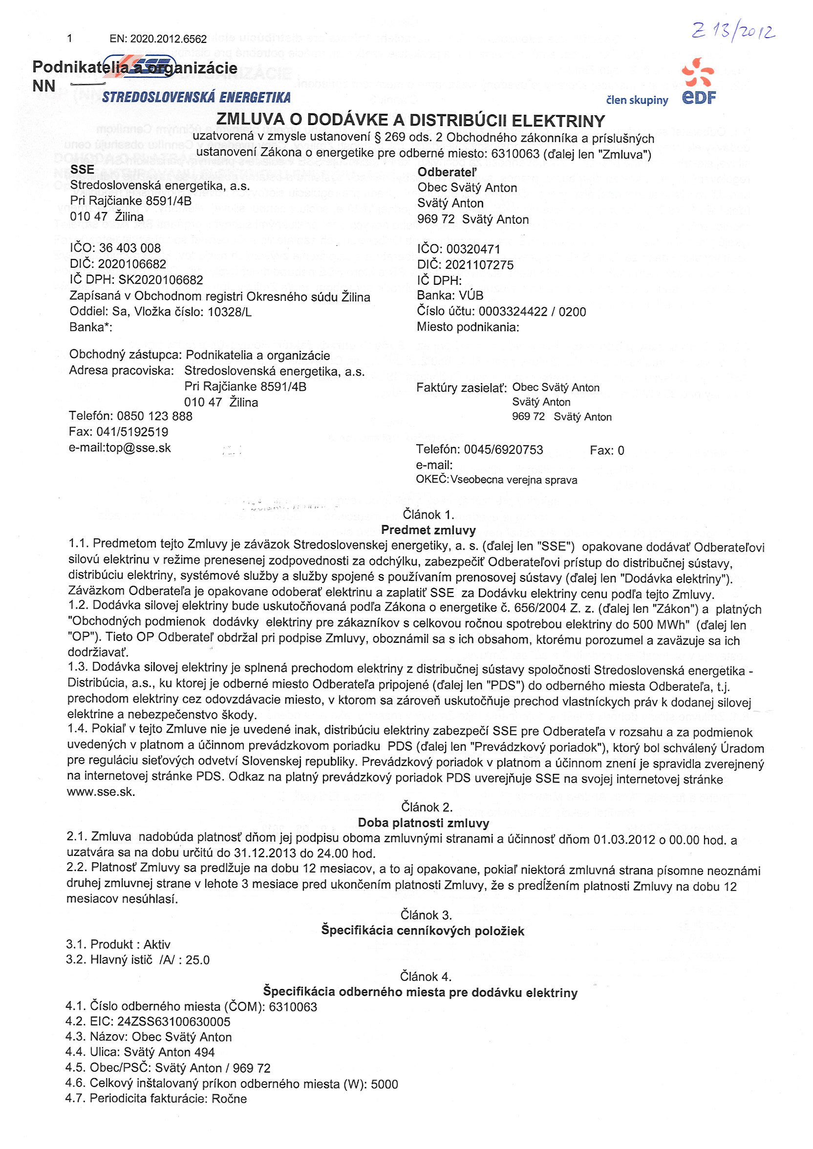 13/2012, Stredoslovenská energetika Žilina, Zmluva o dodávke a distribúcii elektriny |
