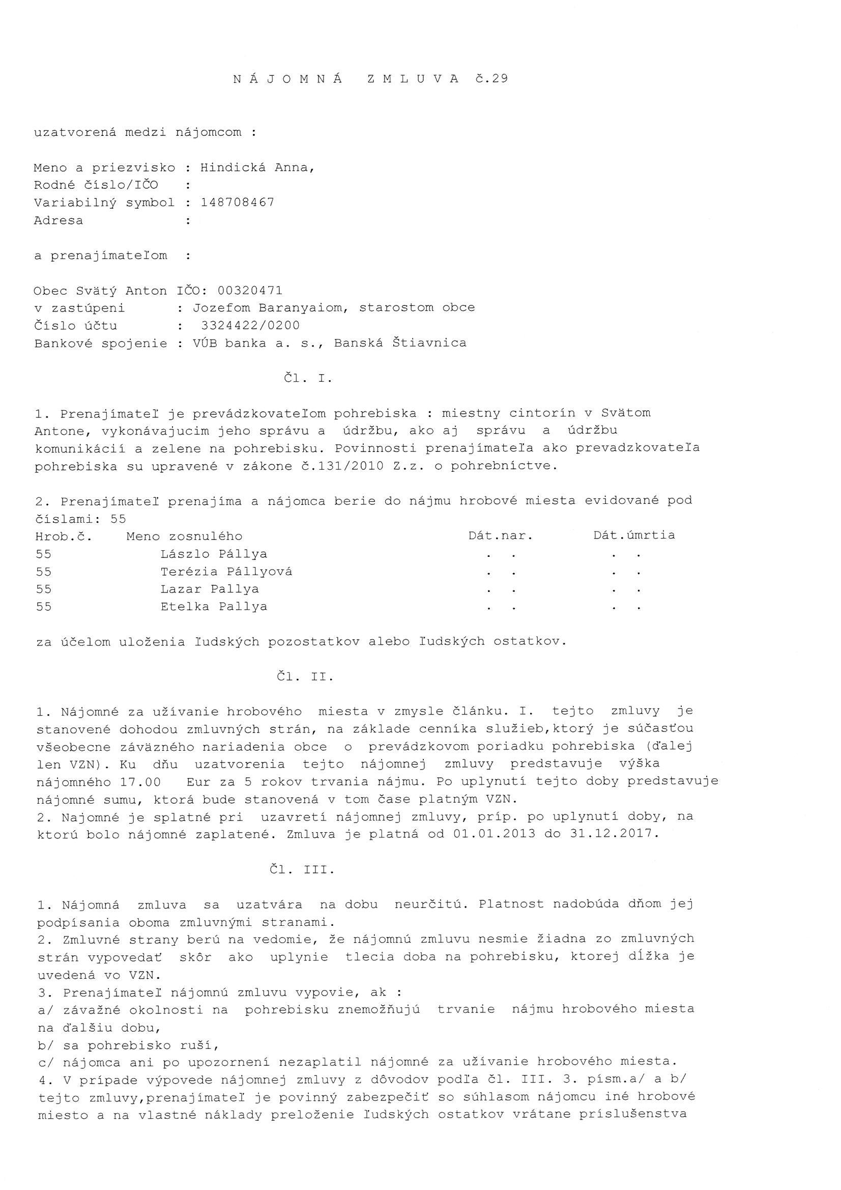 29/2013, Anna Hindická, Prenájom hrobového miesta |
