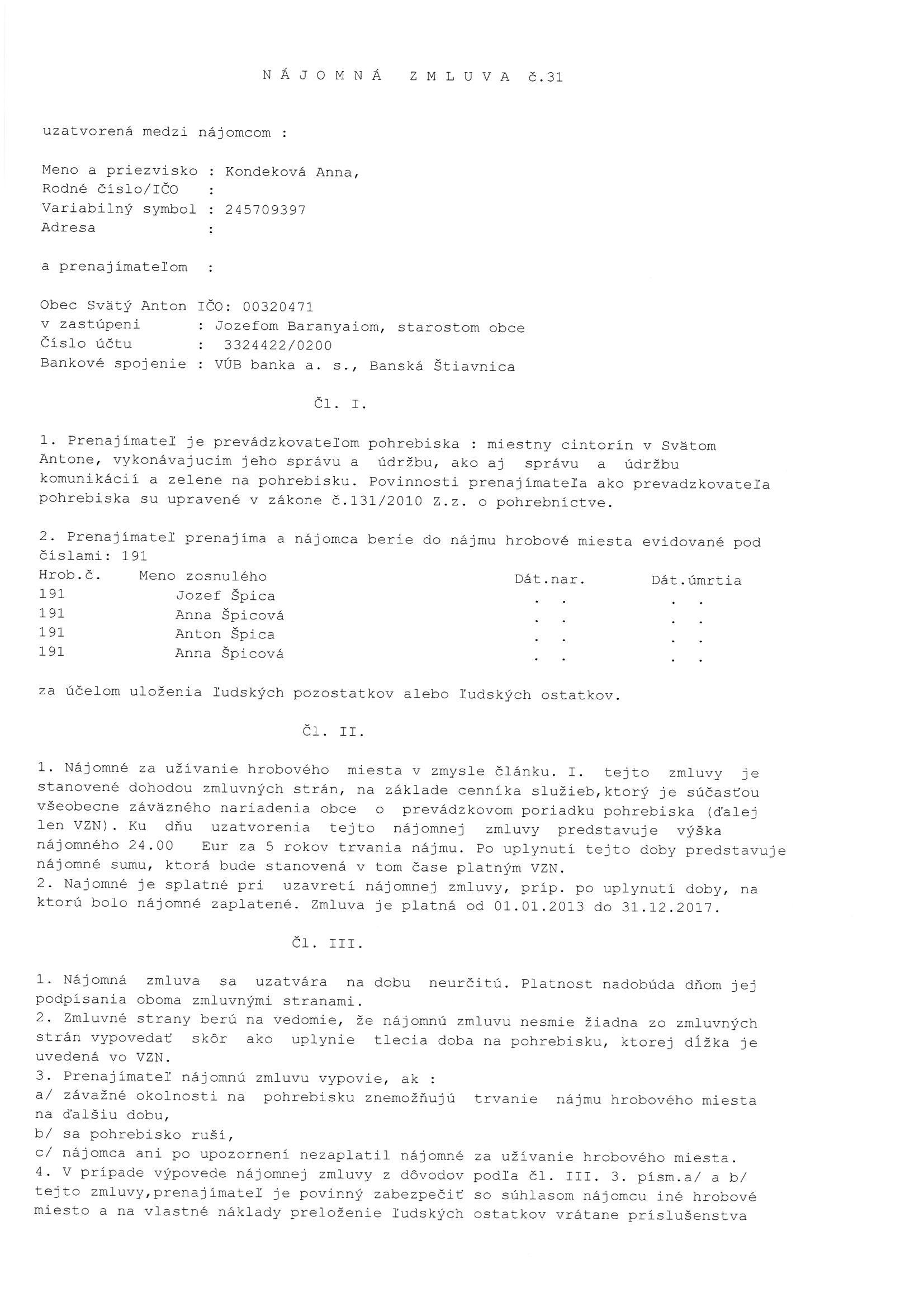 31/2013, Anna Kondeková, Prenájom hrobového miesta |