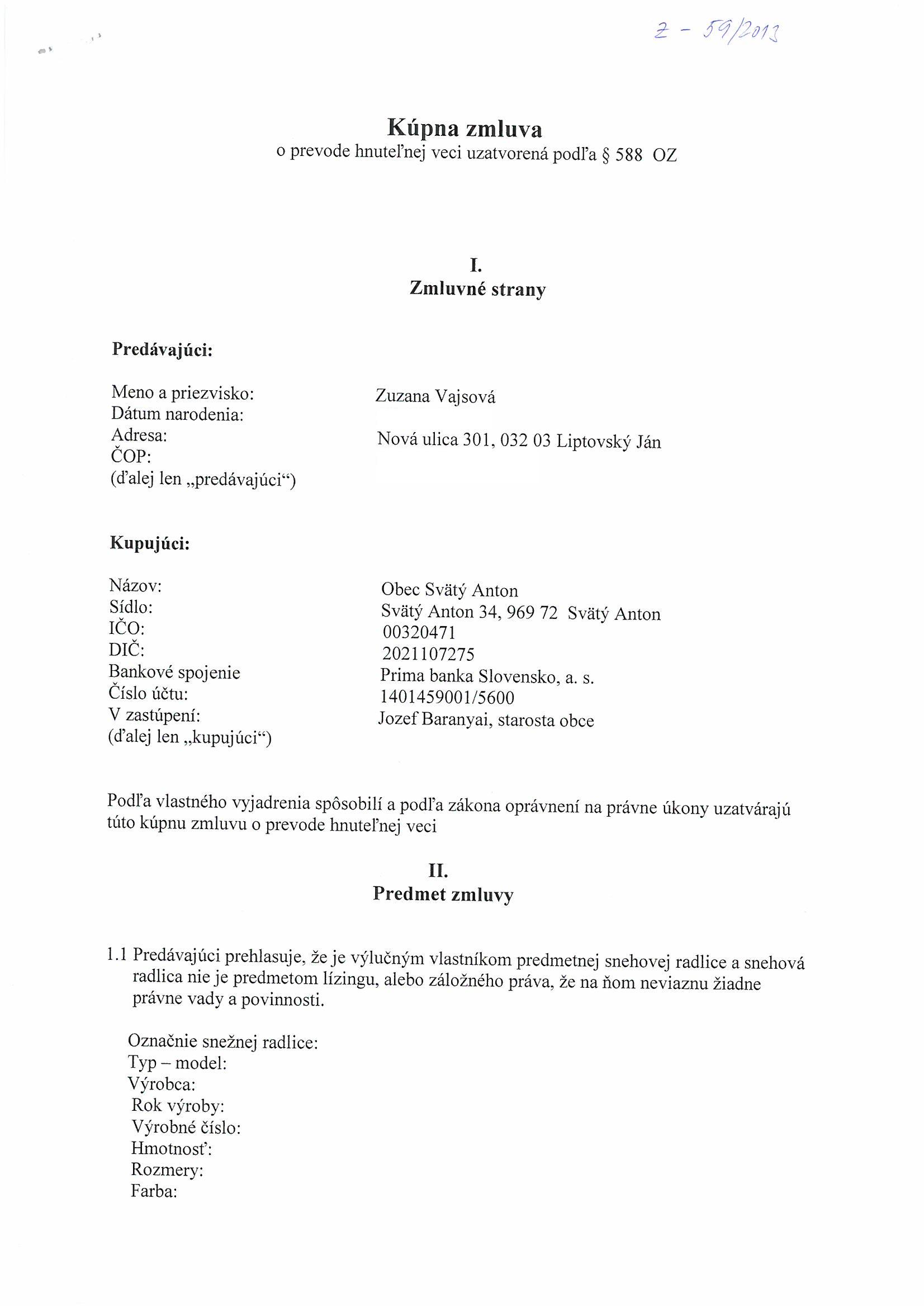 Z 59/2013, Zuzana Vajsová, Nová ulica 301, 03203 Liptovský Ján, Kúpna zmluva |