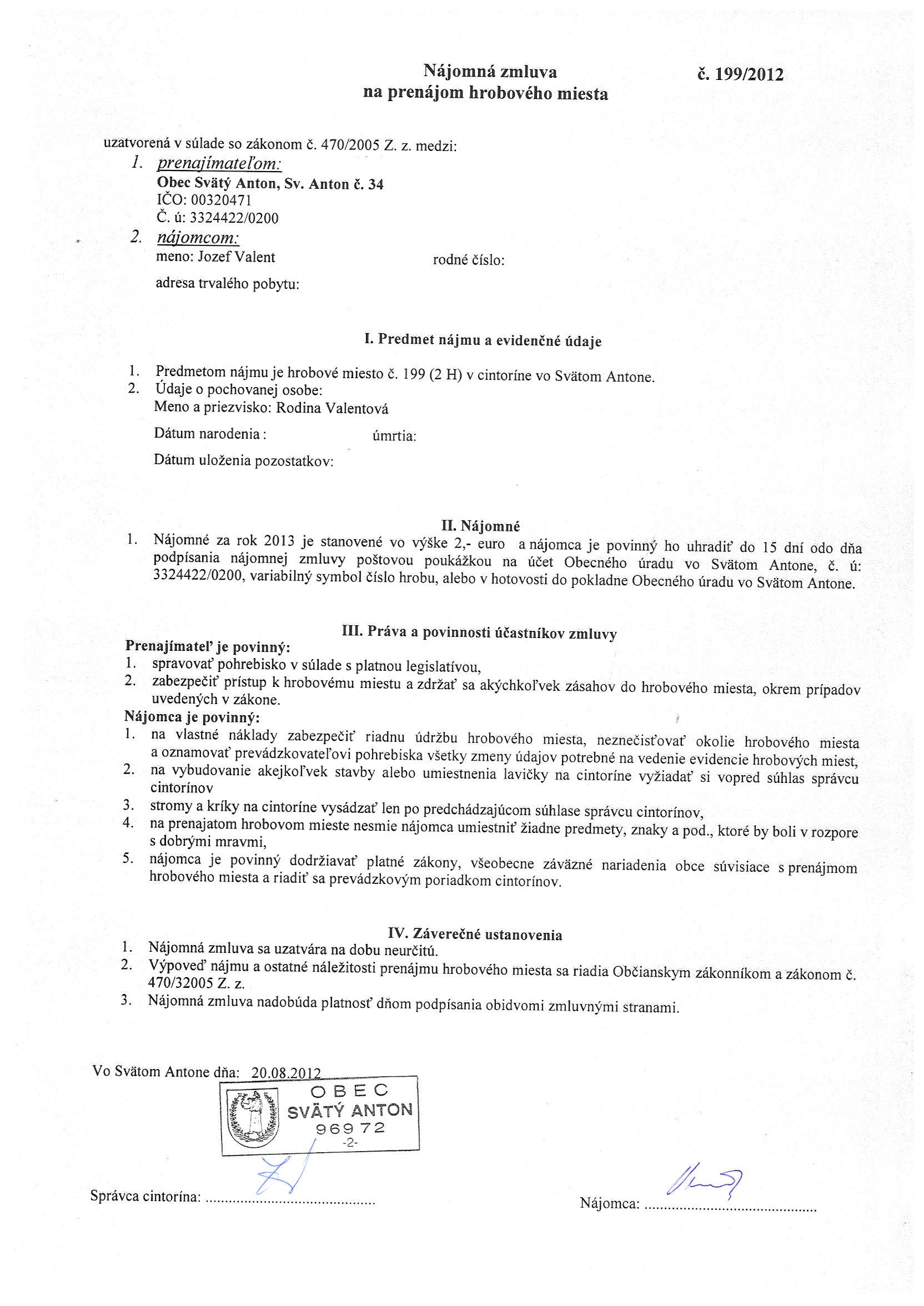 199/2012, Jozef Valent, Prenájom hrobového miesta |