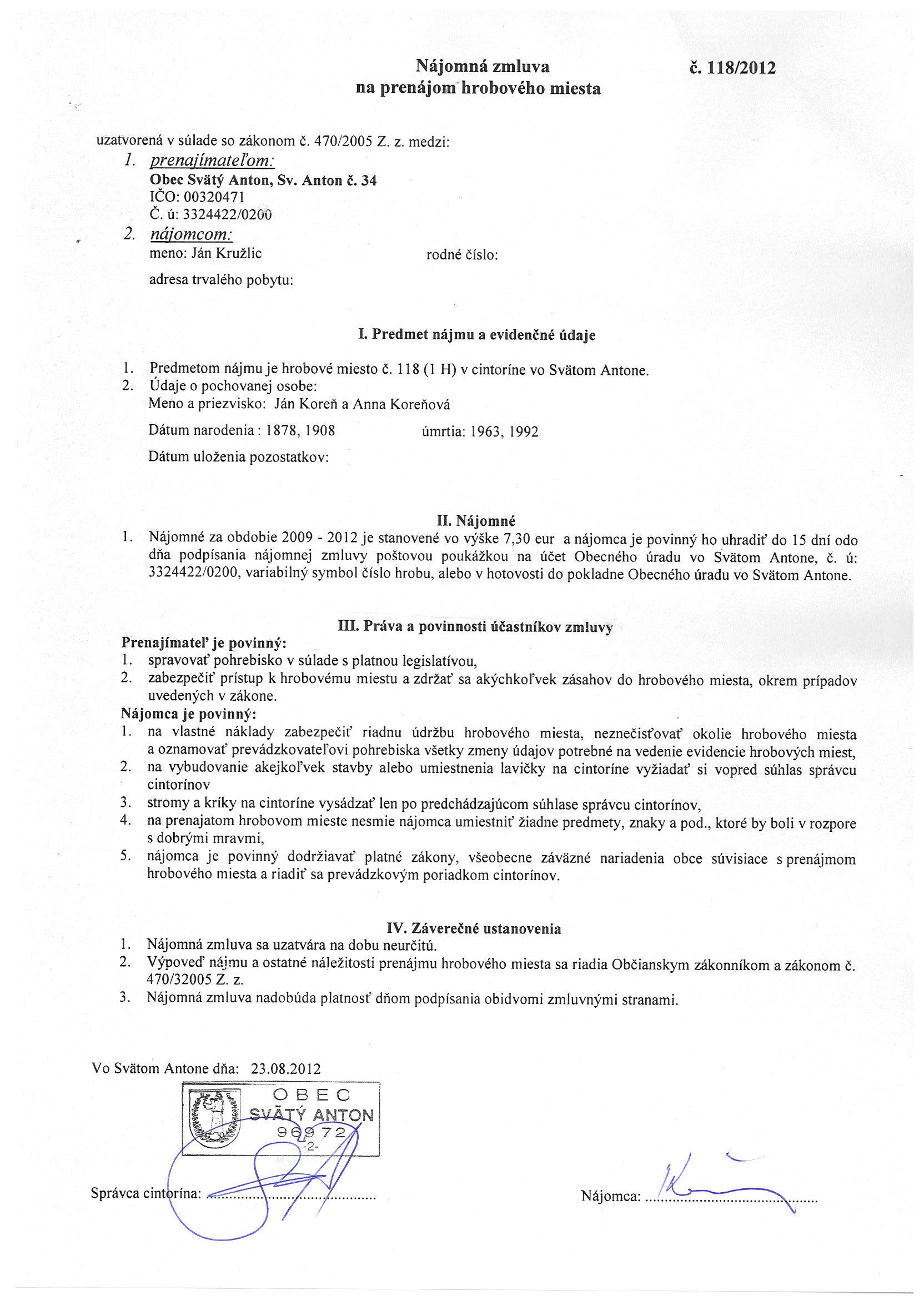 118/2012, Ján Kružlic, Prenájom hrobového miesta |