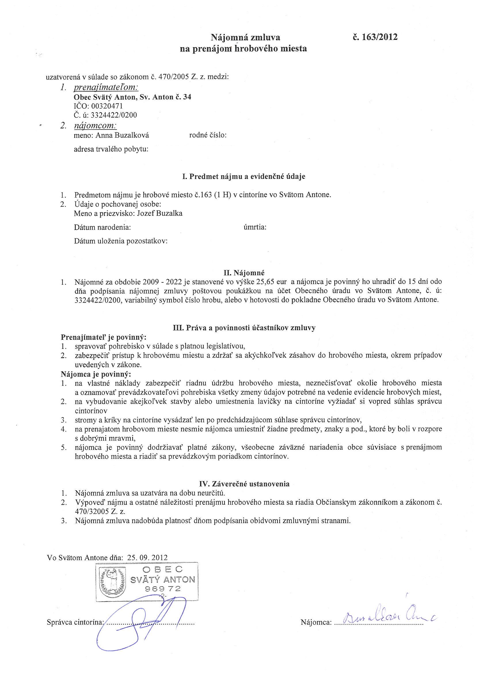 163/2012, Anna Buzalková, Prenájom hrobového miesta |