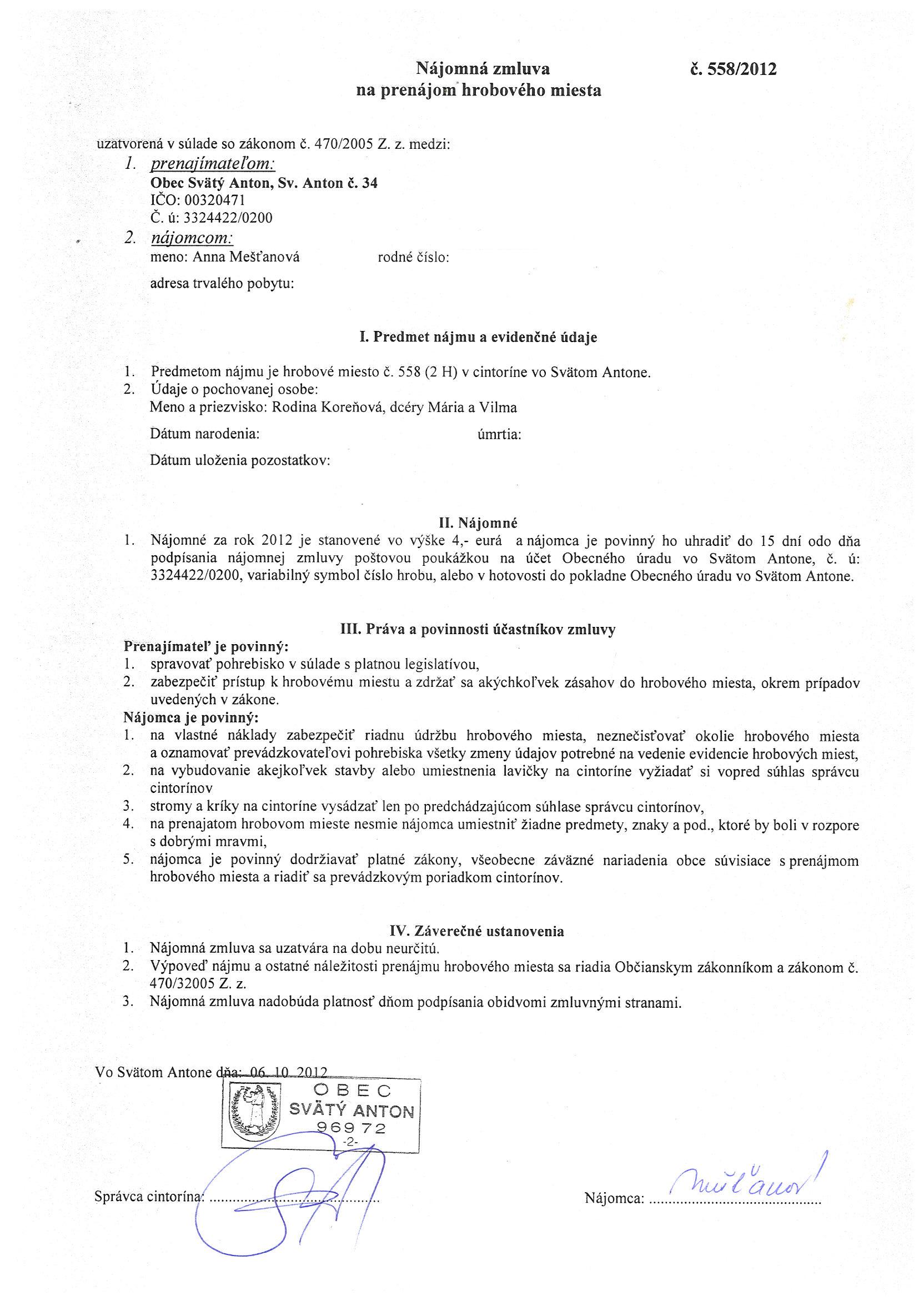 558/2012, Anna Mešťanová, Prenájom hrobového miesta |