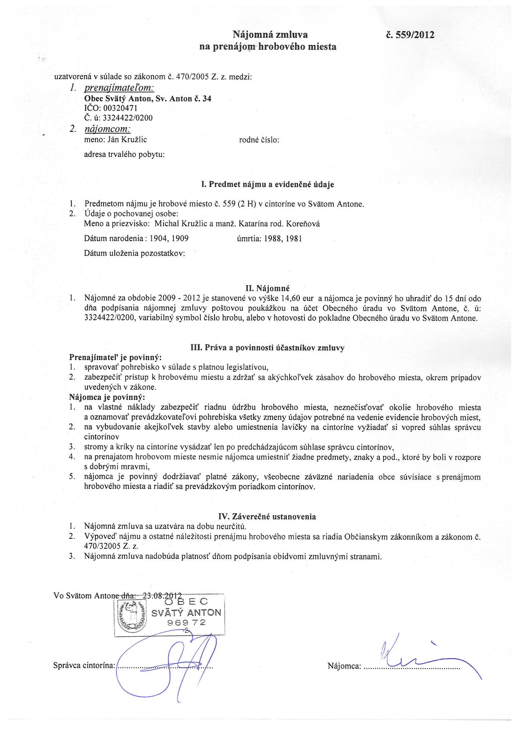 559/2012, Ján Kružlic, Prenájom hrobového miesta |
